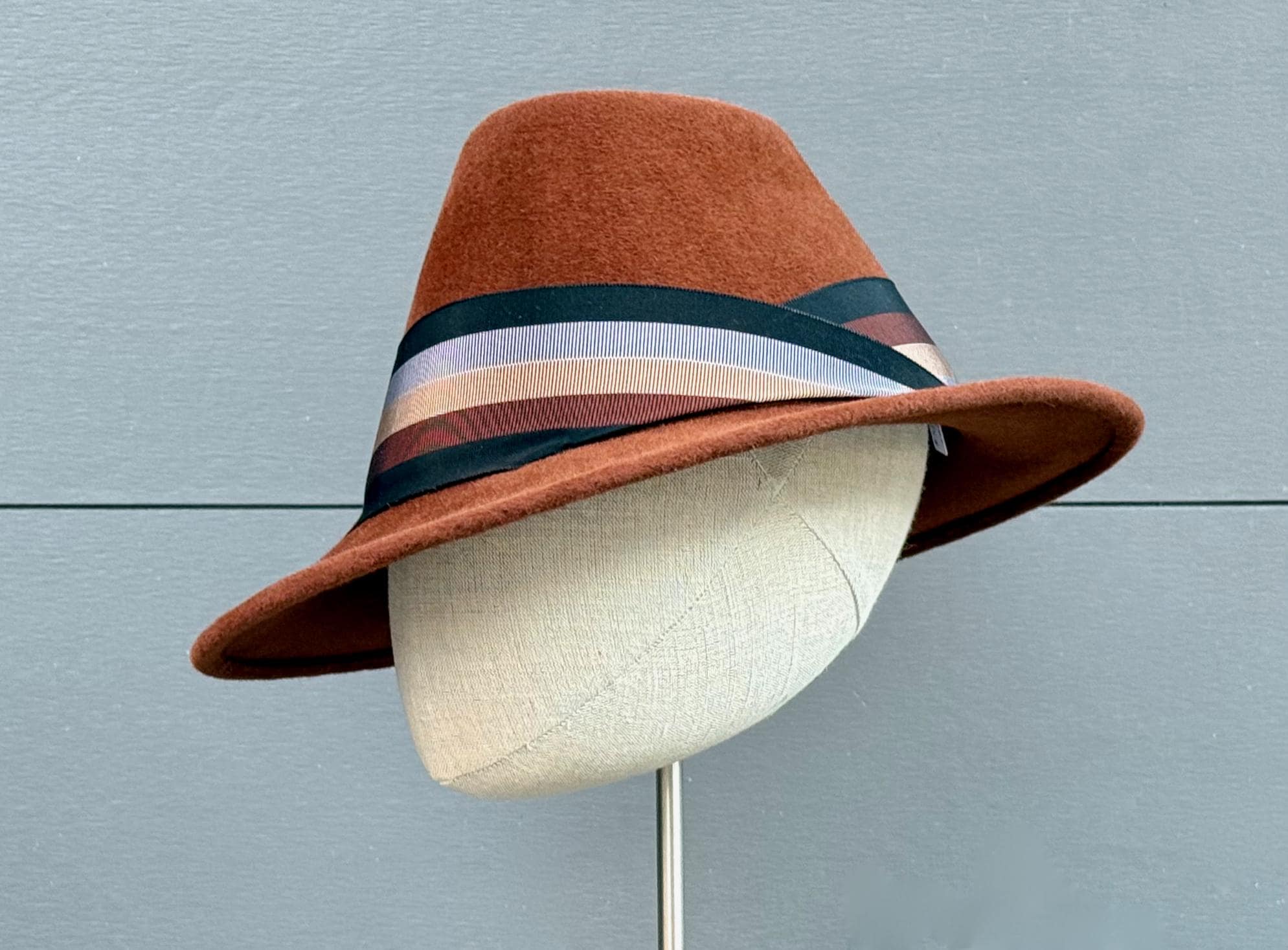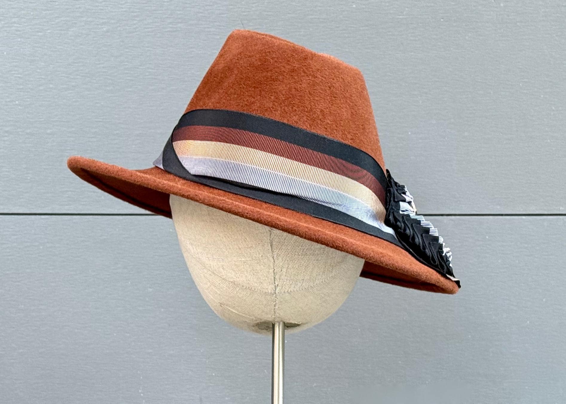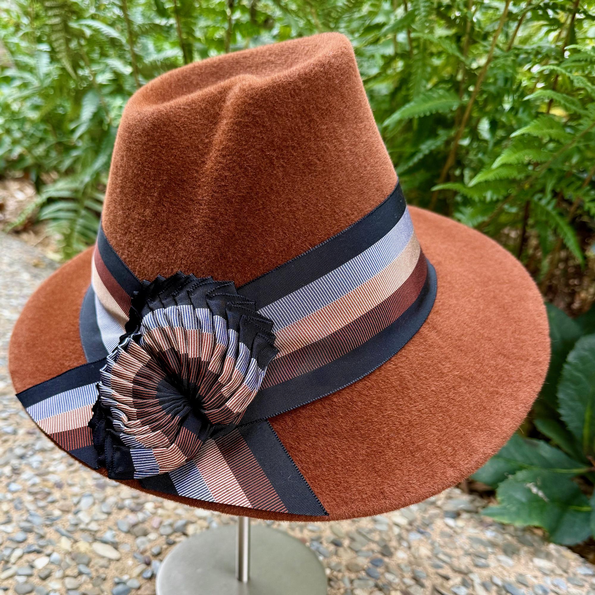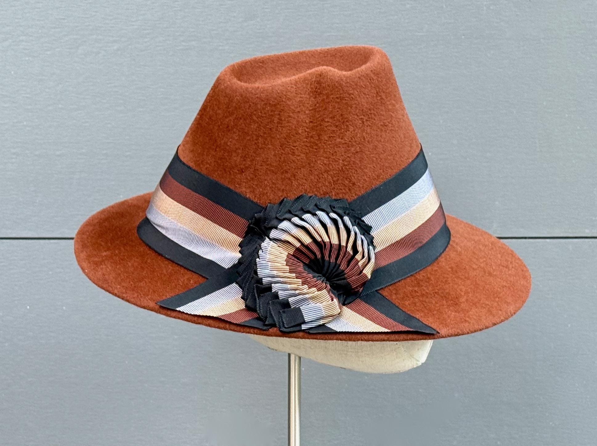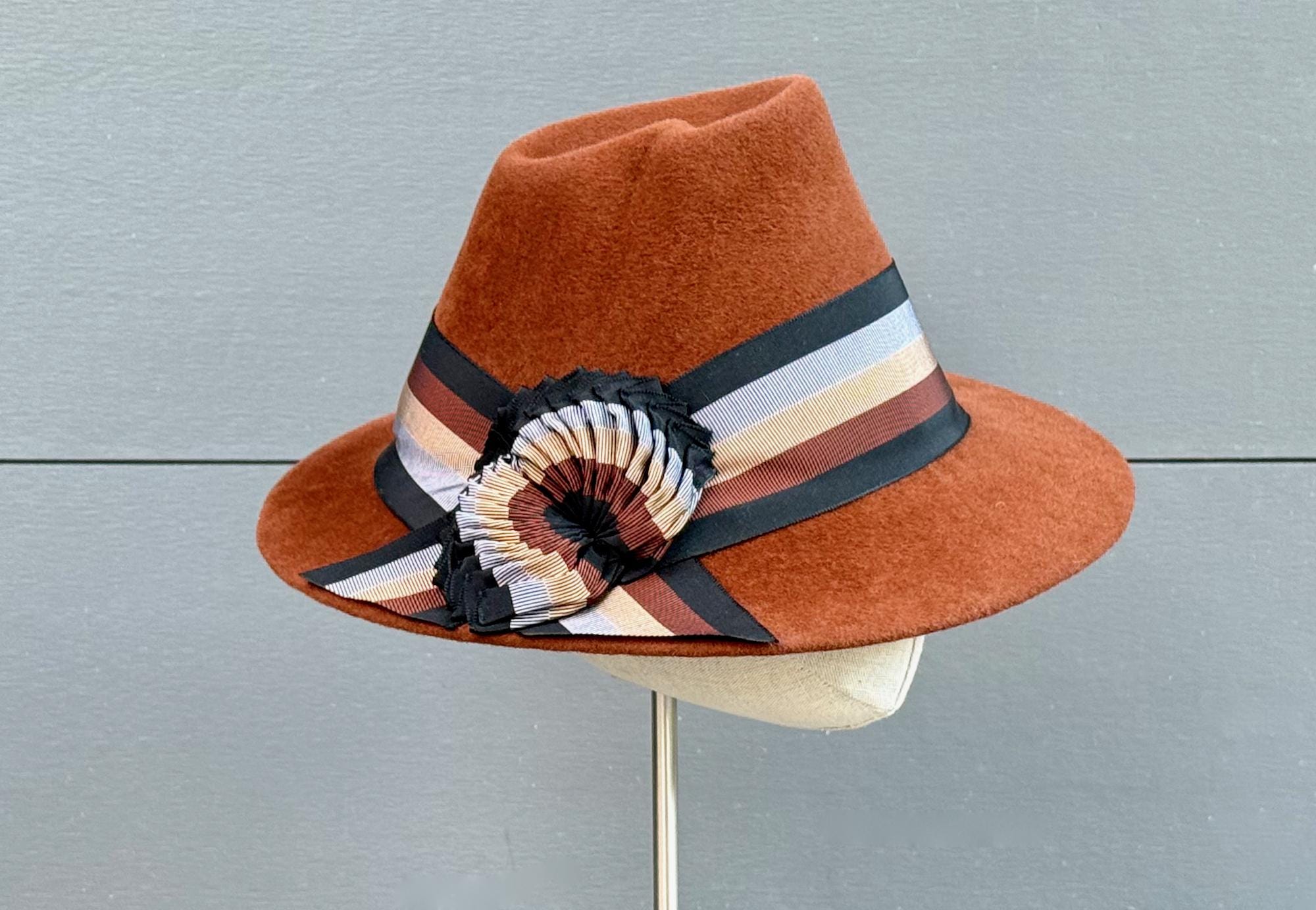This wonderfully stylish velour felt will keep you warm and cozy while inviting all the compliments! Blocked using a pair of asymmetrical, 1940's-era crown and brim blocks, this hat is absolutely one of a kind. To draw even more attention to the tilted brim and crown indentation, I've embellished this one with a wide band and intriguing wing-like ornaments of antique striped ribbon in shades of black, chocolate brown, camel, and blue-gray. It will go with sooo many cold-weather outfits!