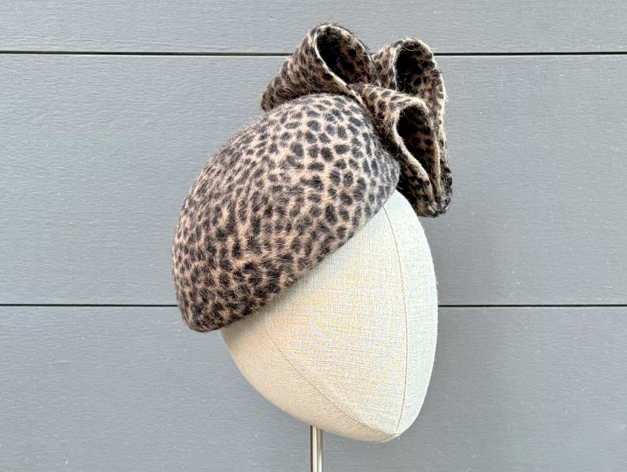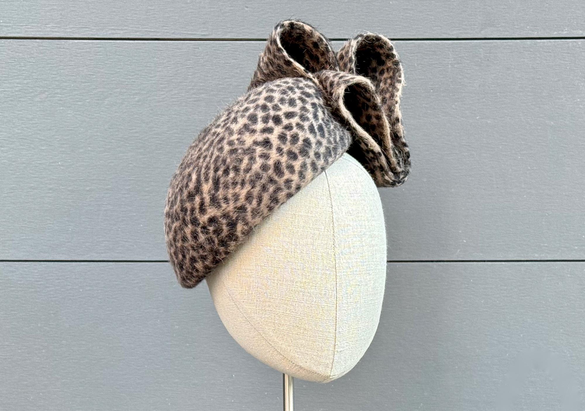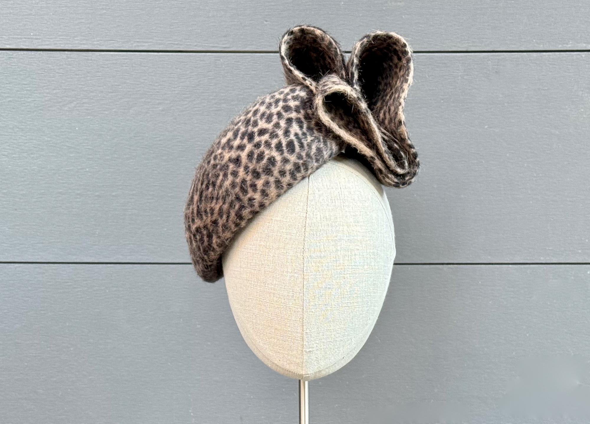 This little perching beret is such a snazzy, fun, and flattering hat to wear during the cold weather months! Blocked in a long-pile animal-print fur felt and with an elegantly modern embellishment of felt loops, this one will go with practically anything you want to wear this season!