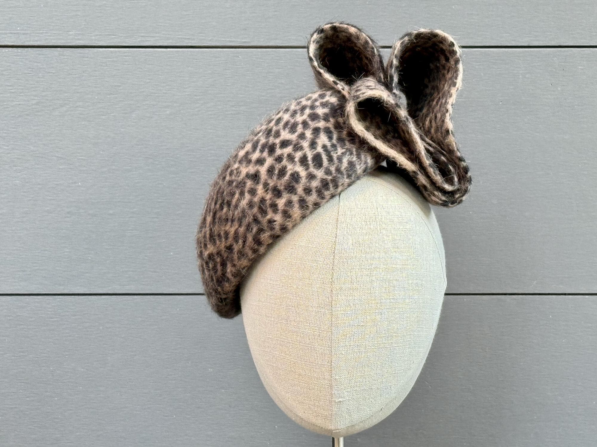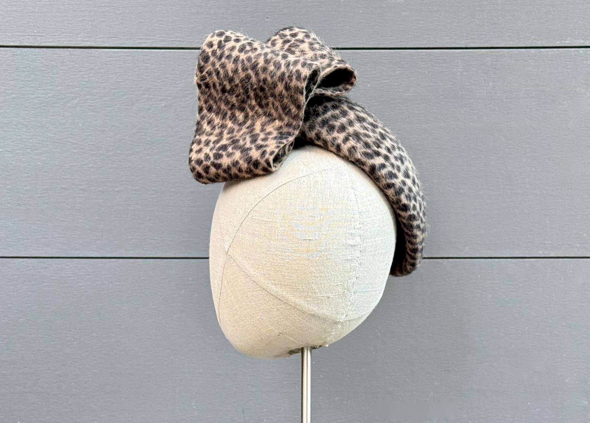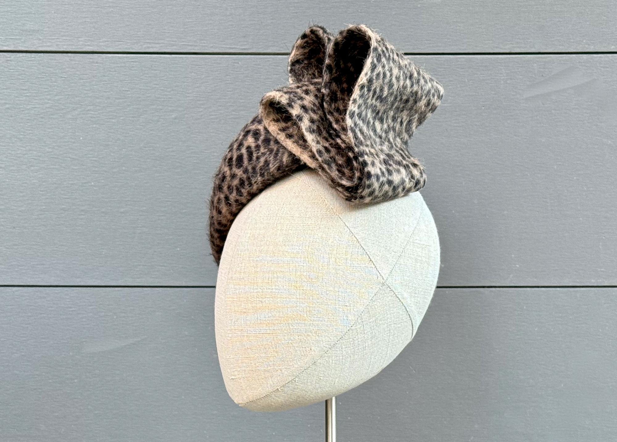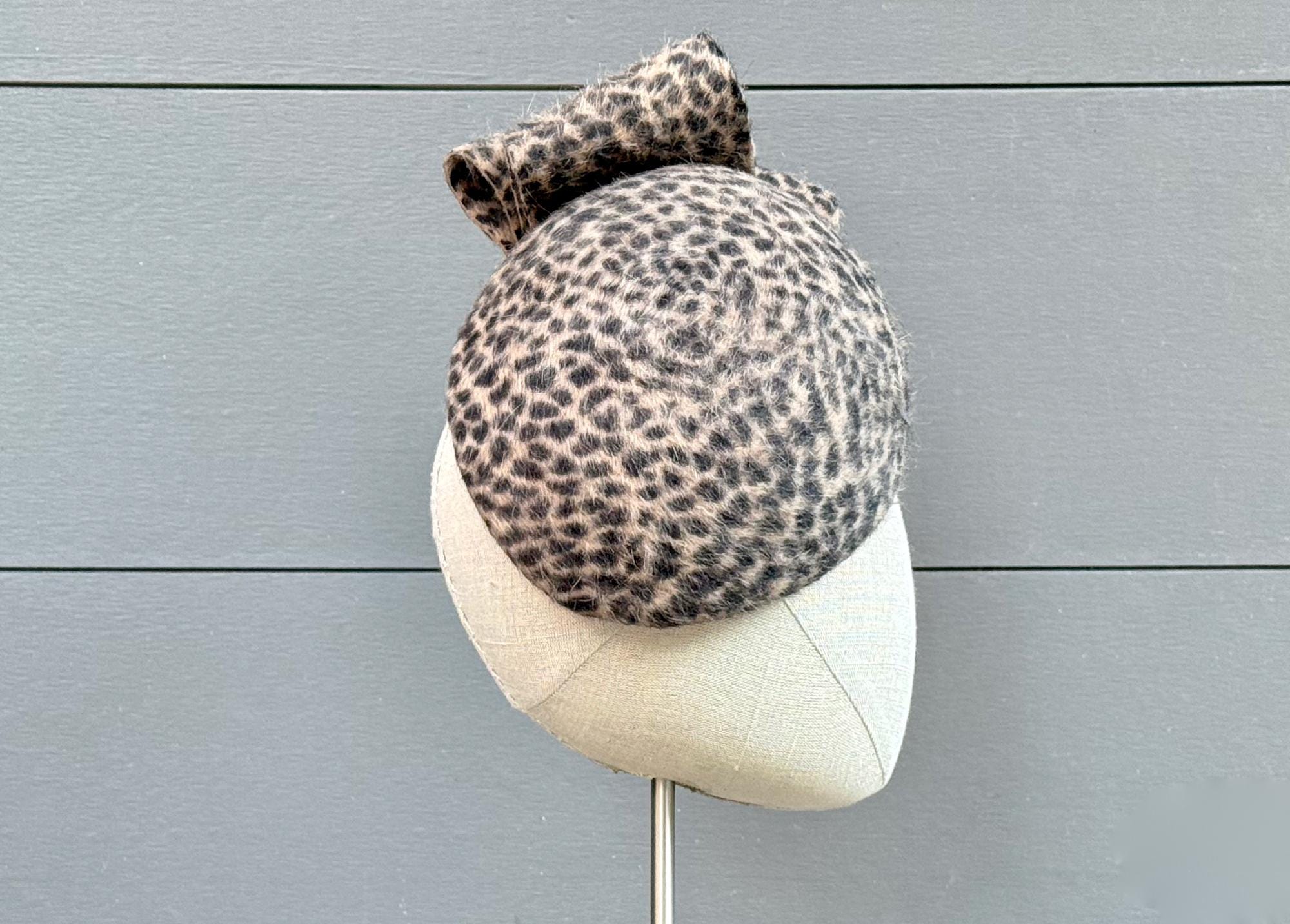 This little perching beret is such a snazzy, fun, and flattering hat to wear during the cold weather months! Blocked in a long-pile animal-print fur felt and with an elegantly modern embellishment of felt loops, this one will go with practically anything you want to wear this season!