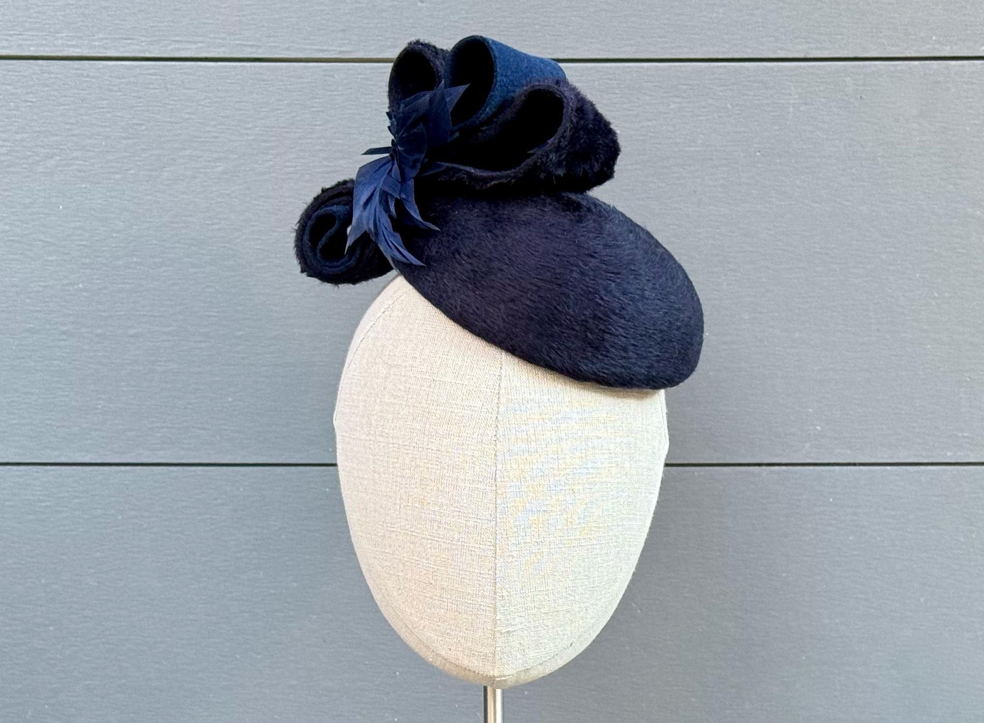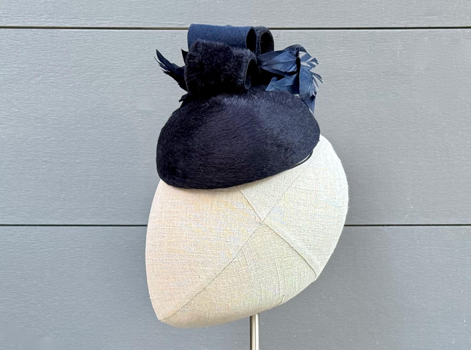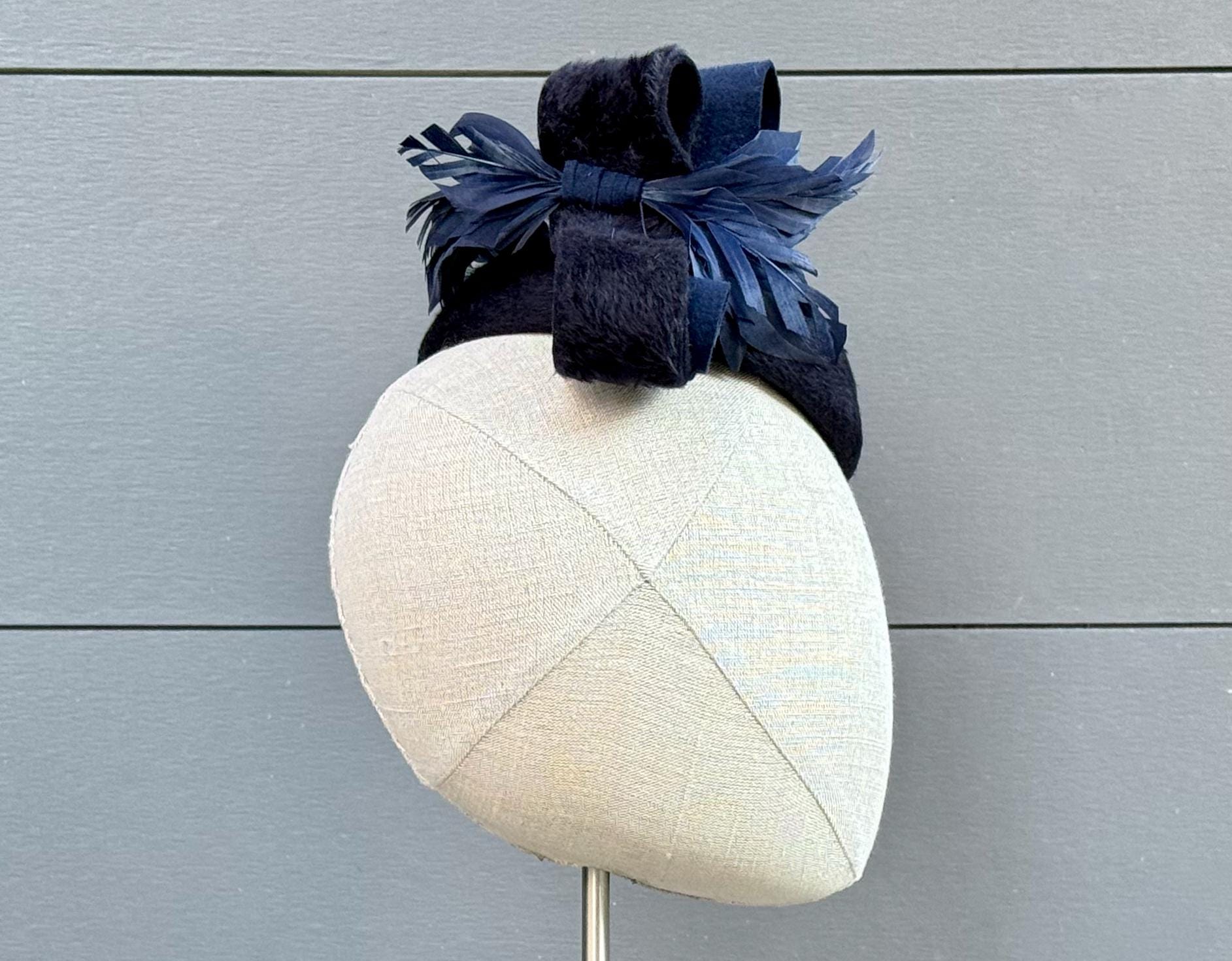 This lovely little perching hat in shades of navy blue is the perfect little neutral--but by no means boring!--accessory for all manner of elevated cold weather ensembles! Blocked from a very special vintage long-pile fur felt hat body (with the original French manufacturer's stamp still visible inside), I've attached loops of the same felt plus another coordinating felt to add interest. A little ornament of curled navy feathers accents this looped trim beautifully!