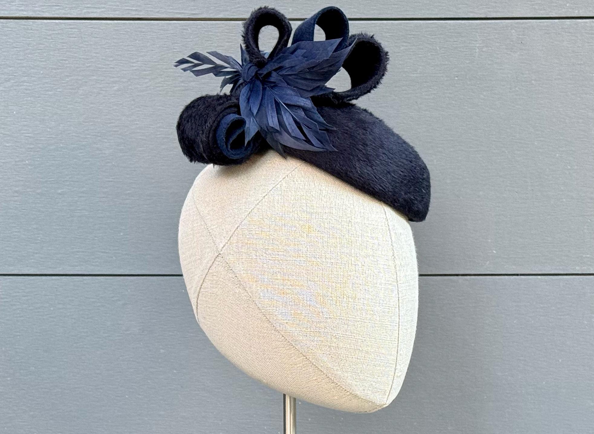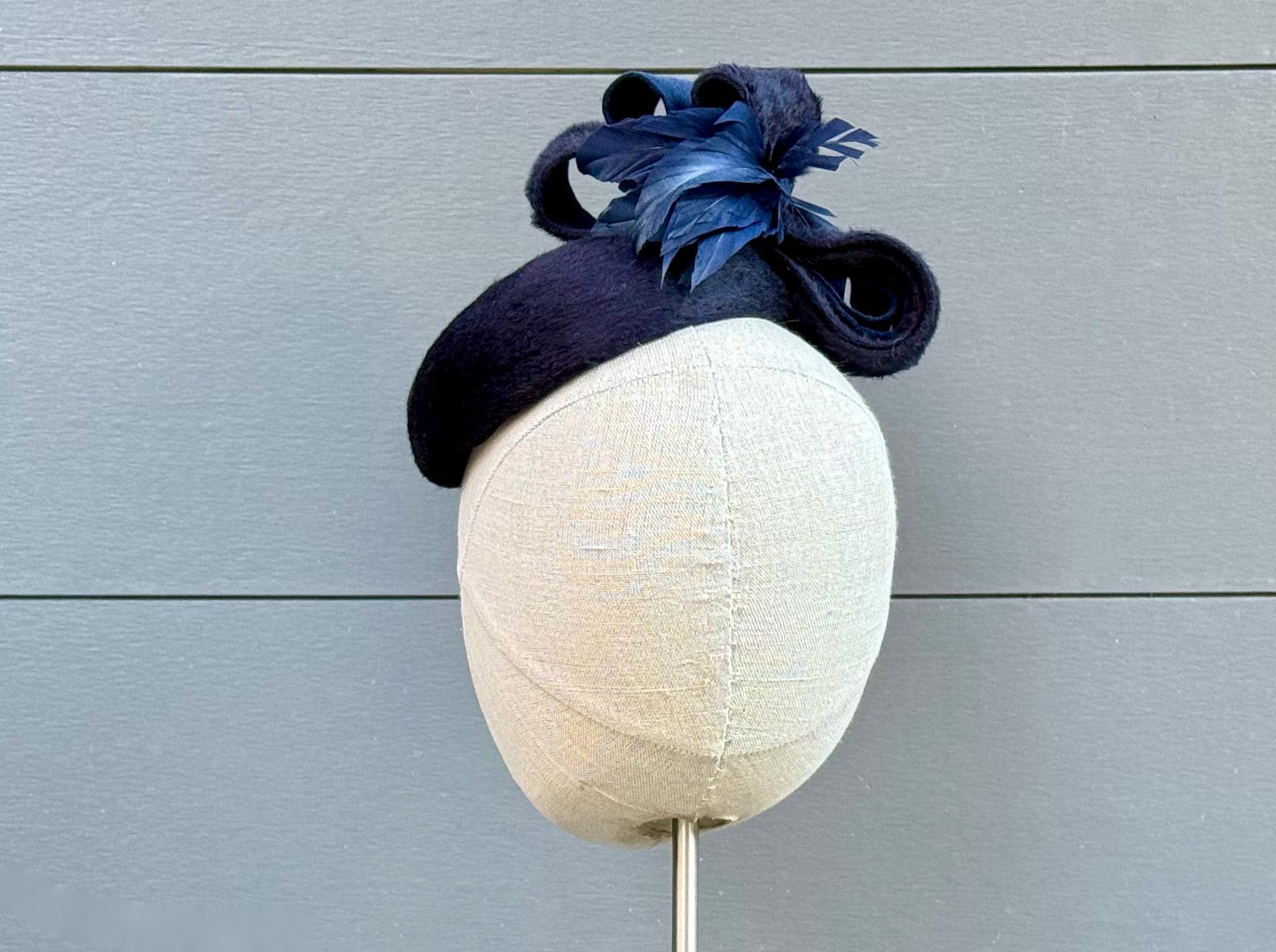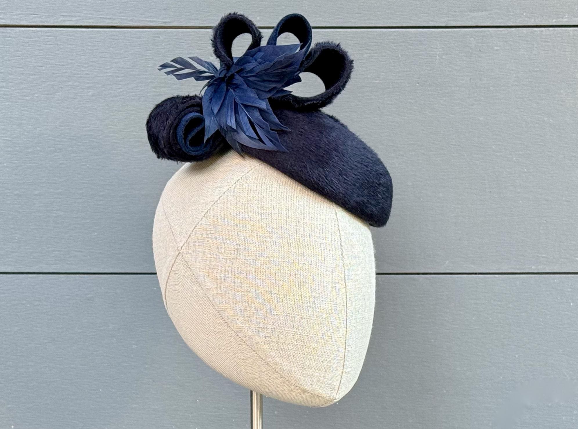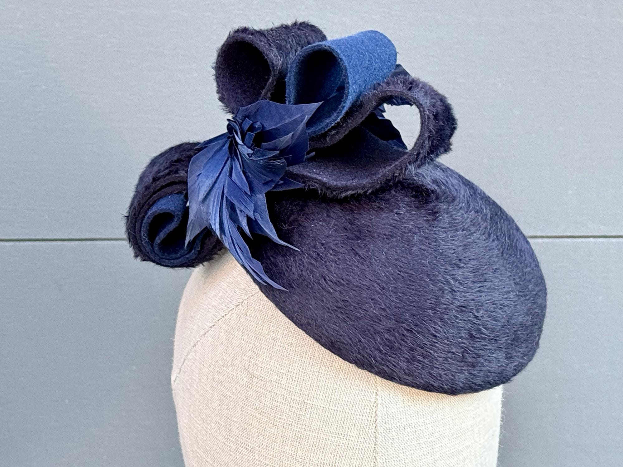 This lovely little perching hat in shades of navy blue is the perfect little neutral--but by no means boring!--accessory for all manner of elevated cold weather ensembles! Blocked from a very special vintage long-pile fur felt hat body (with the original French manufacturer's stamp still visible inside), I've attached loops of the same felt plus another coordinating felt to add interest. A little ornament of curled navy feathers accents this looped trim beautifully!