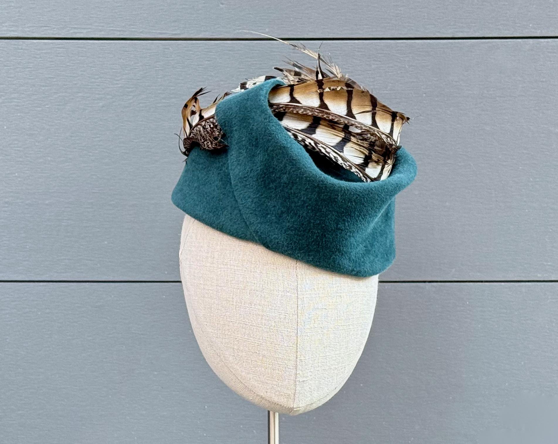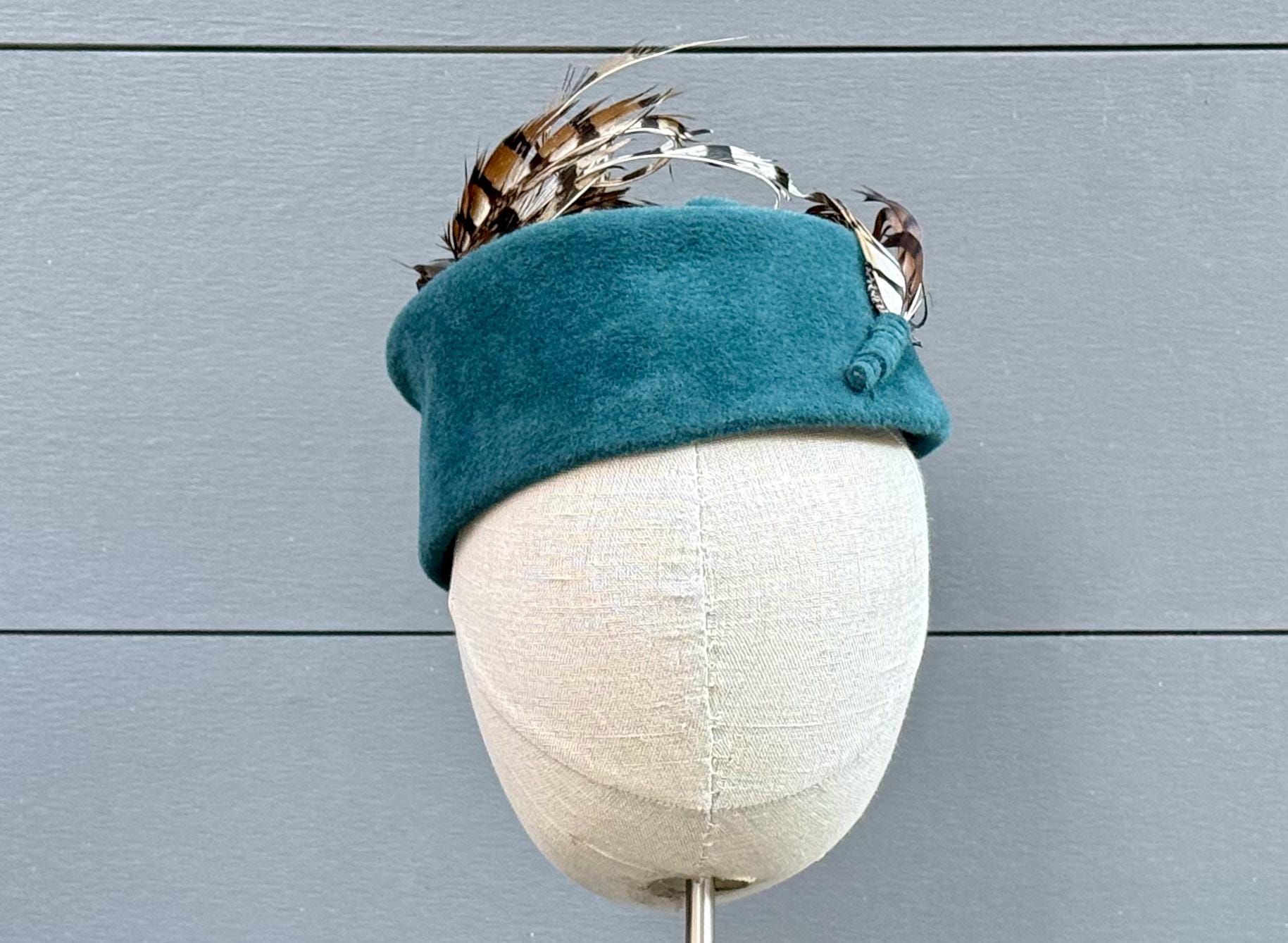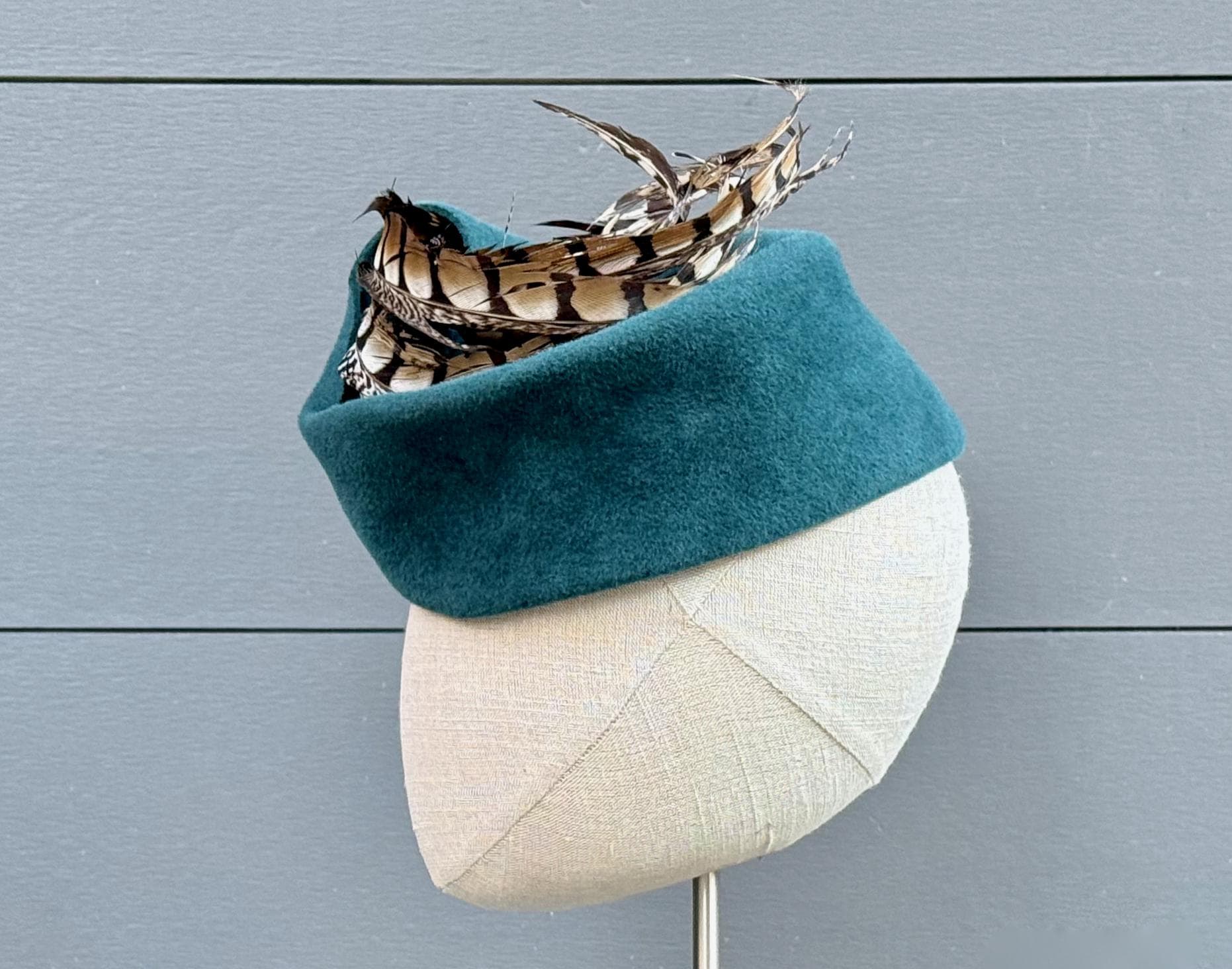 Blocked from a plush velour felt in a sophisticated, moody shade of teal, this hand-sculpted hat is absolutely one-of-a kind. Wear it an angle perched off to one side and let those dramatic curled pheasant feathers do the talking! It's a real stunner--and you will be, too, while wearing it!
