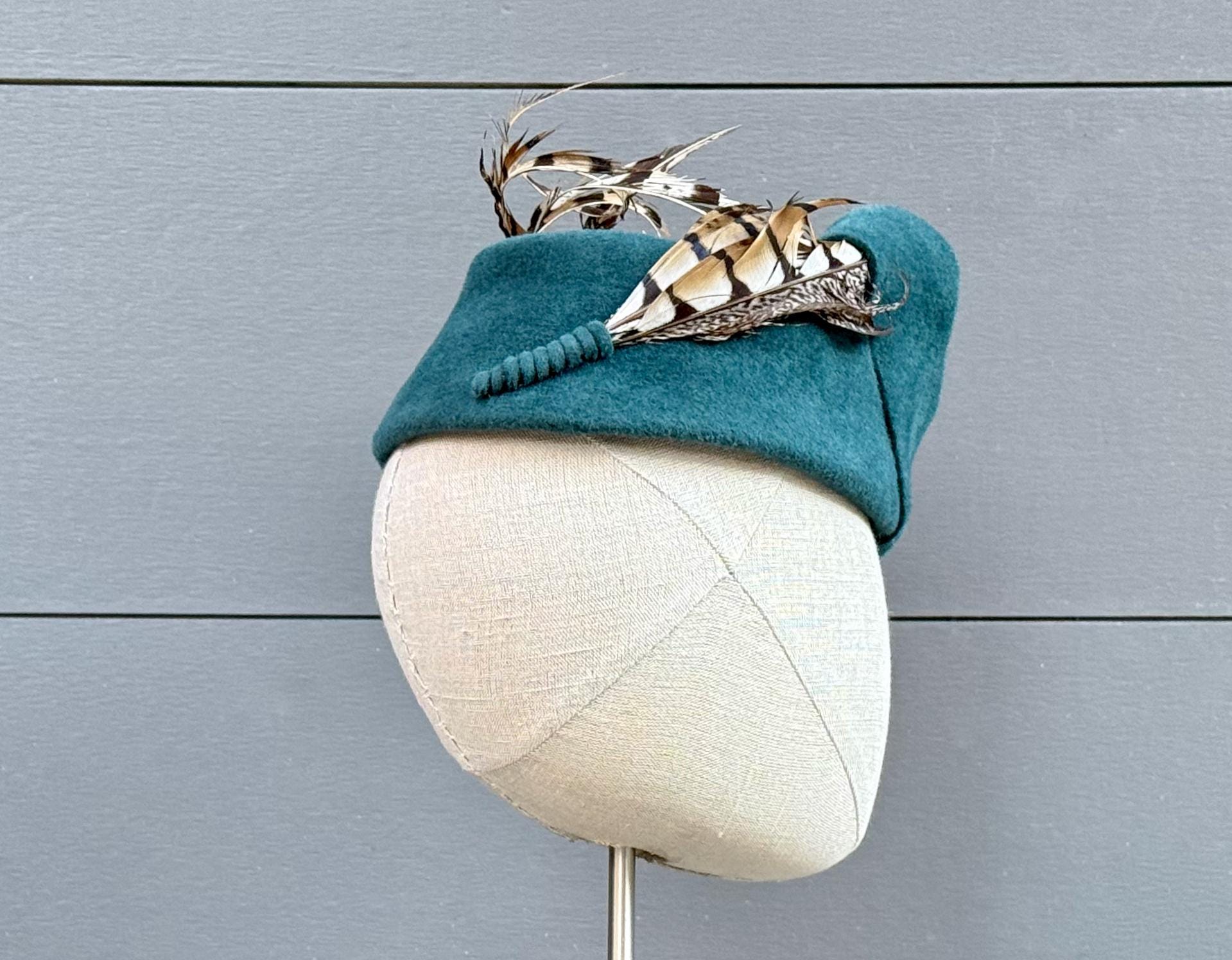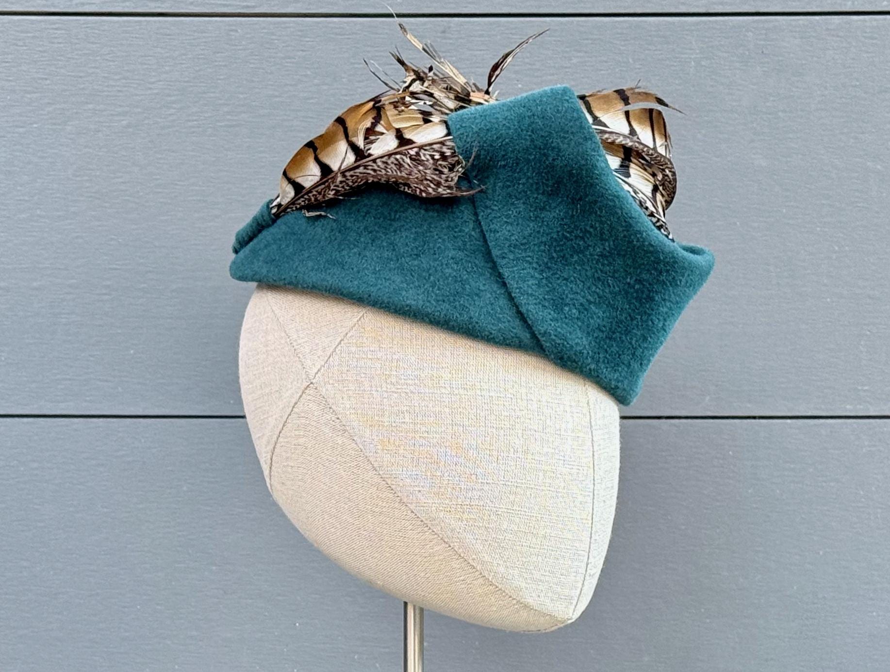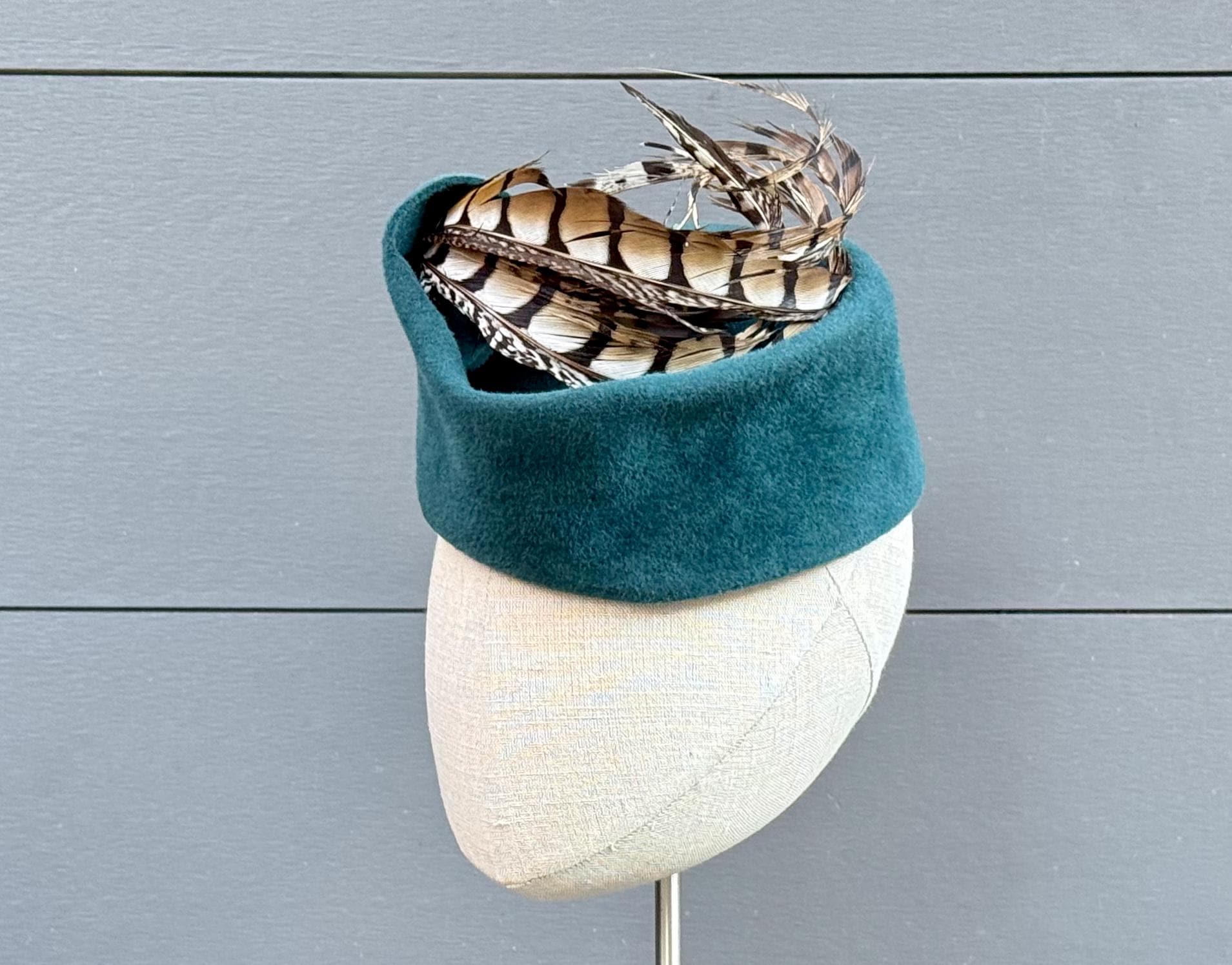 Blocked from a plush velour felt in a sophisticated, moody shade of teal, this hand-sculpted hat is absolutely one-of-a kind. Wear it an angle perched off to one side and let those dramatic curled pheasant feathers do the talking! It's a real stunner--and you will be, too, while wearing it!