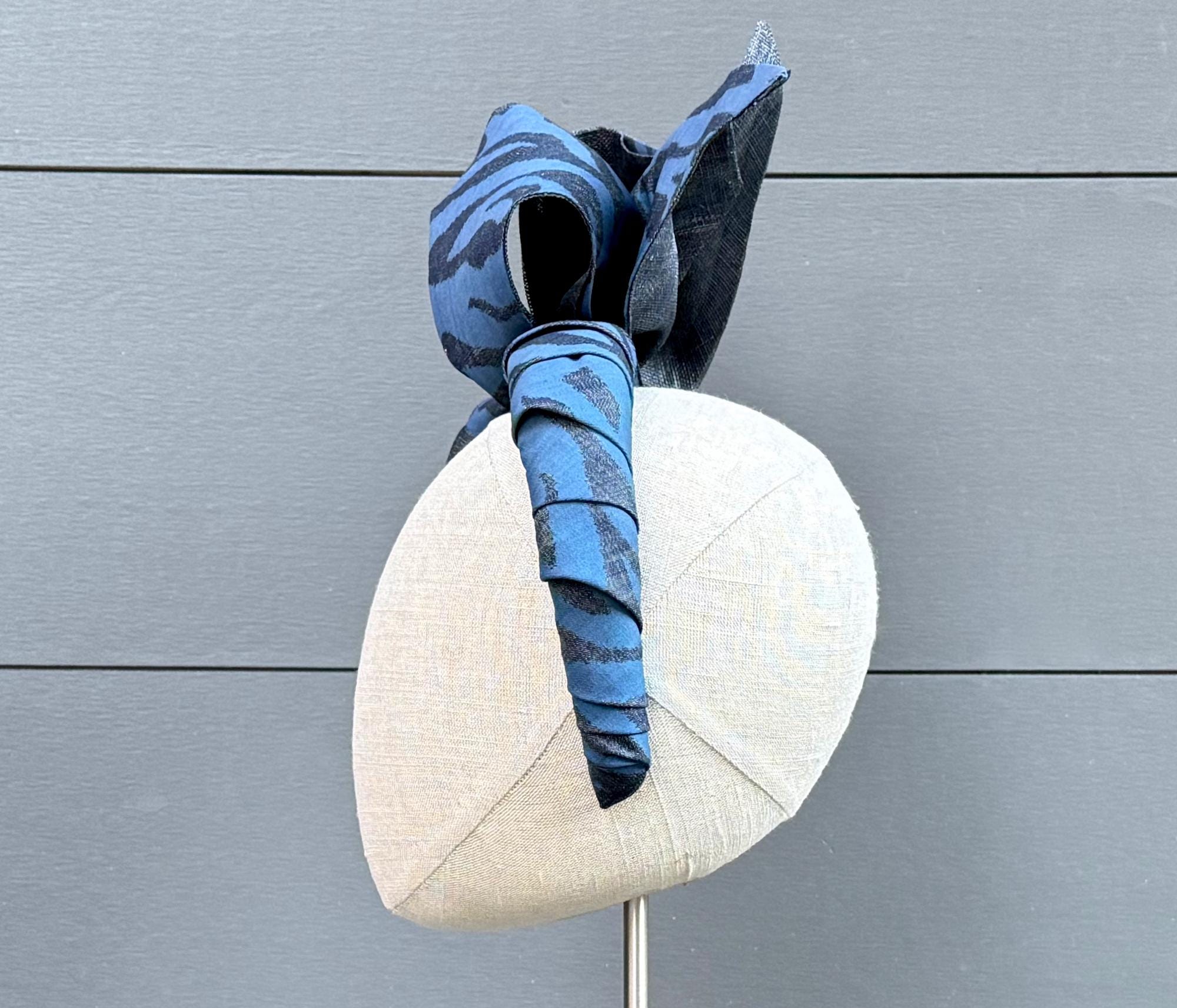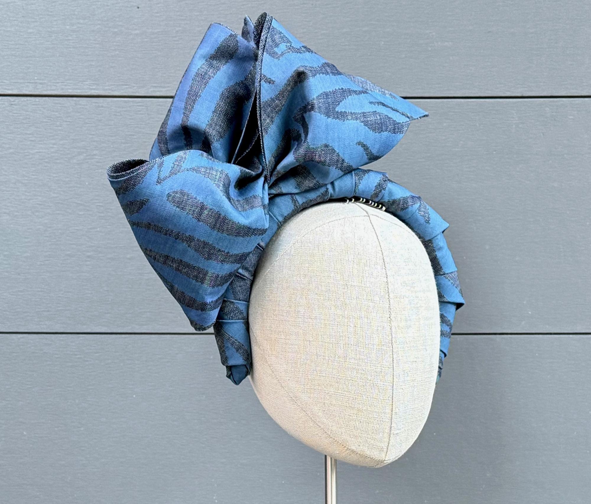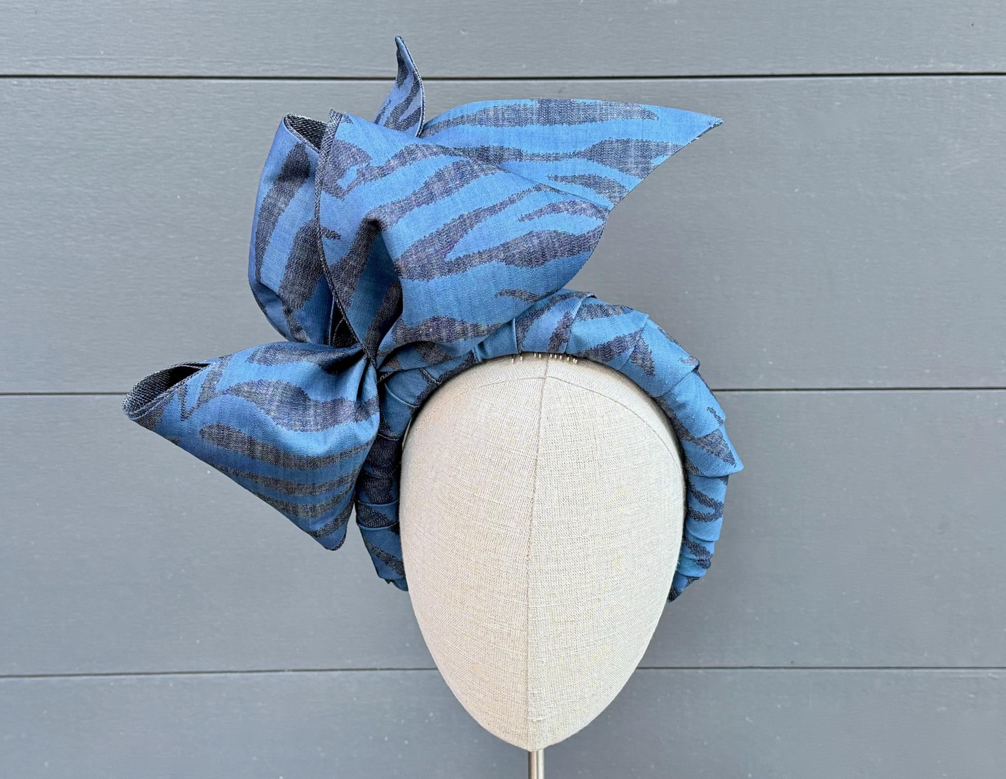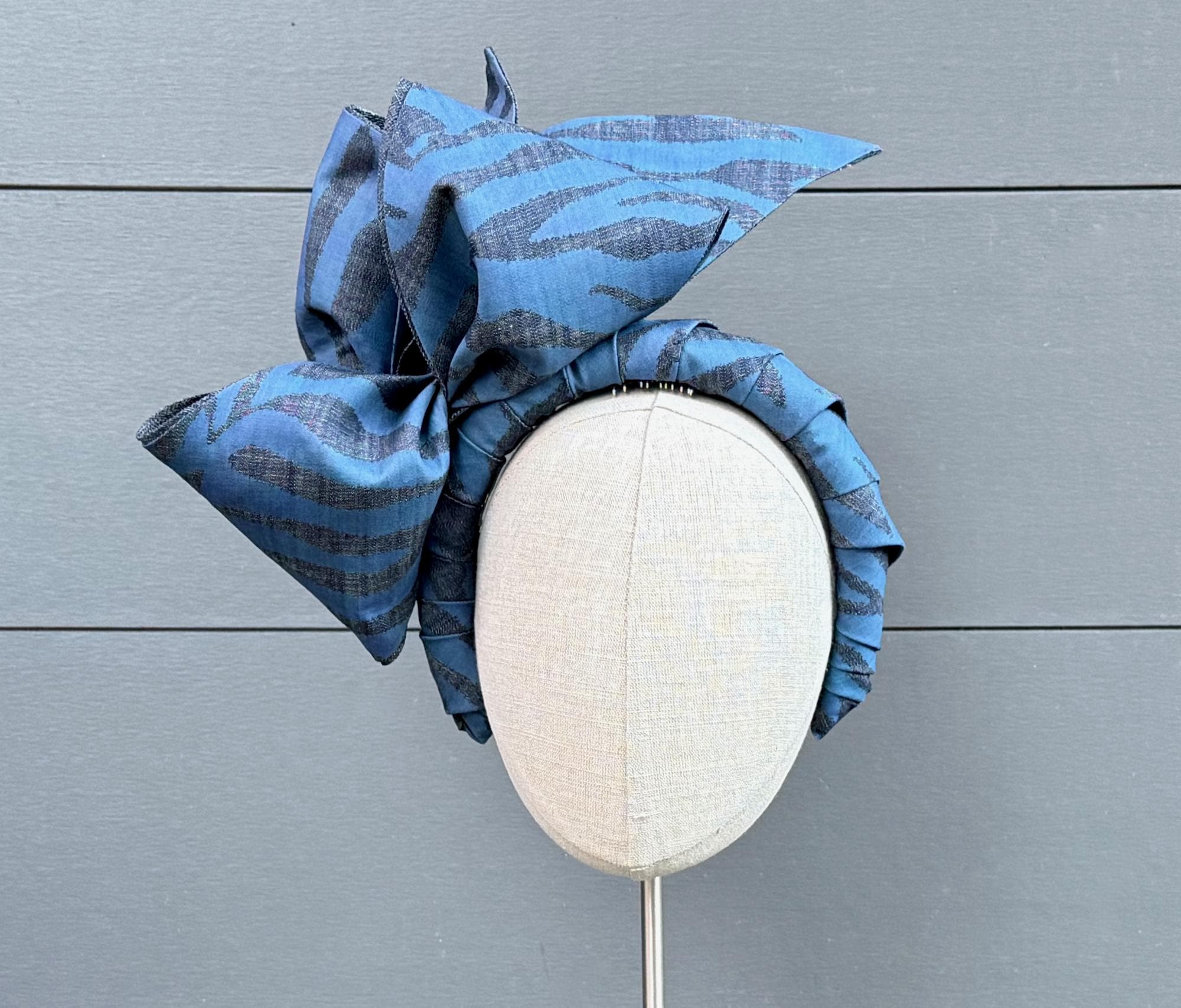 This simply spectacular headband with its oversized bow will turn all heads! The fabric wrapping the headband and making up the front of the bow is a wonderful abstract print of textured gray and denim blue that will go with so many warm-weather ensembles. I see it at a poolside soirée, an art exhibition opening, or even the Kentucky Derby!