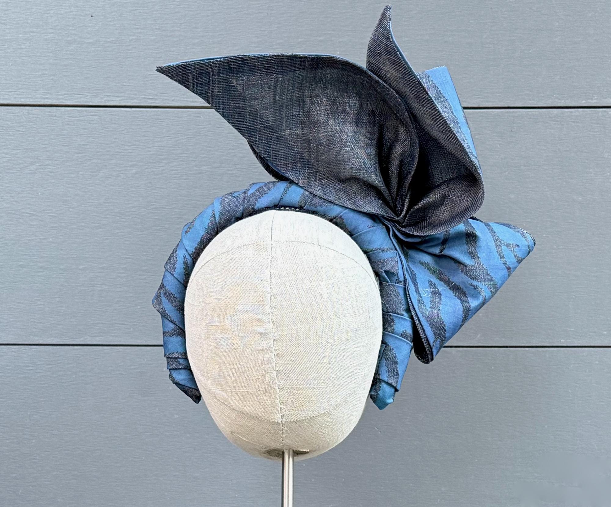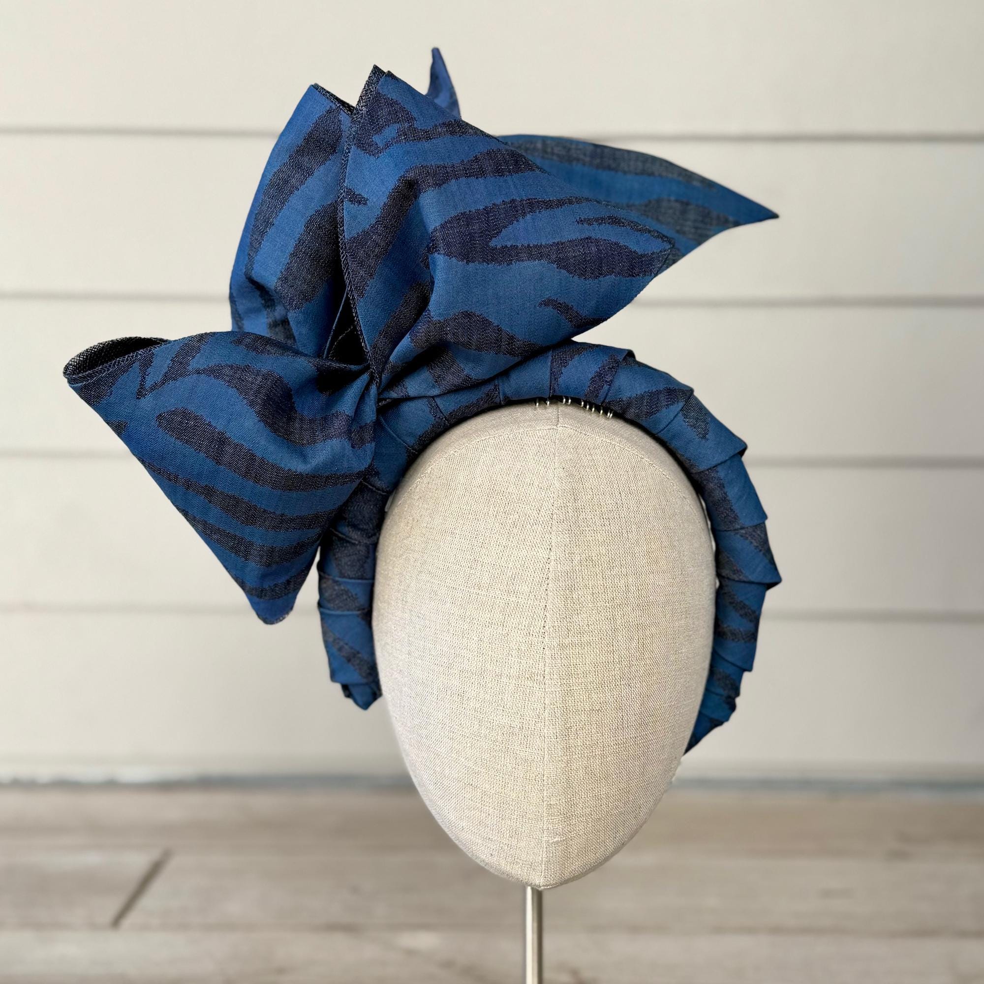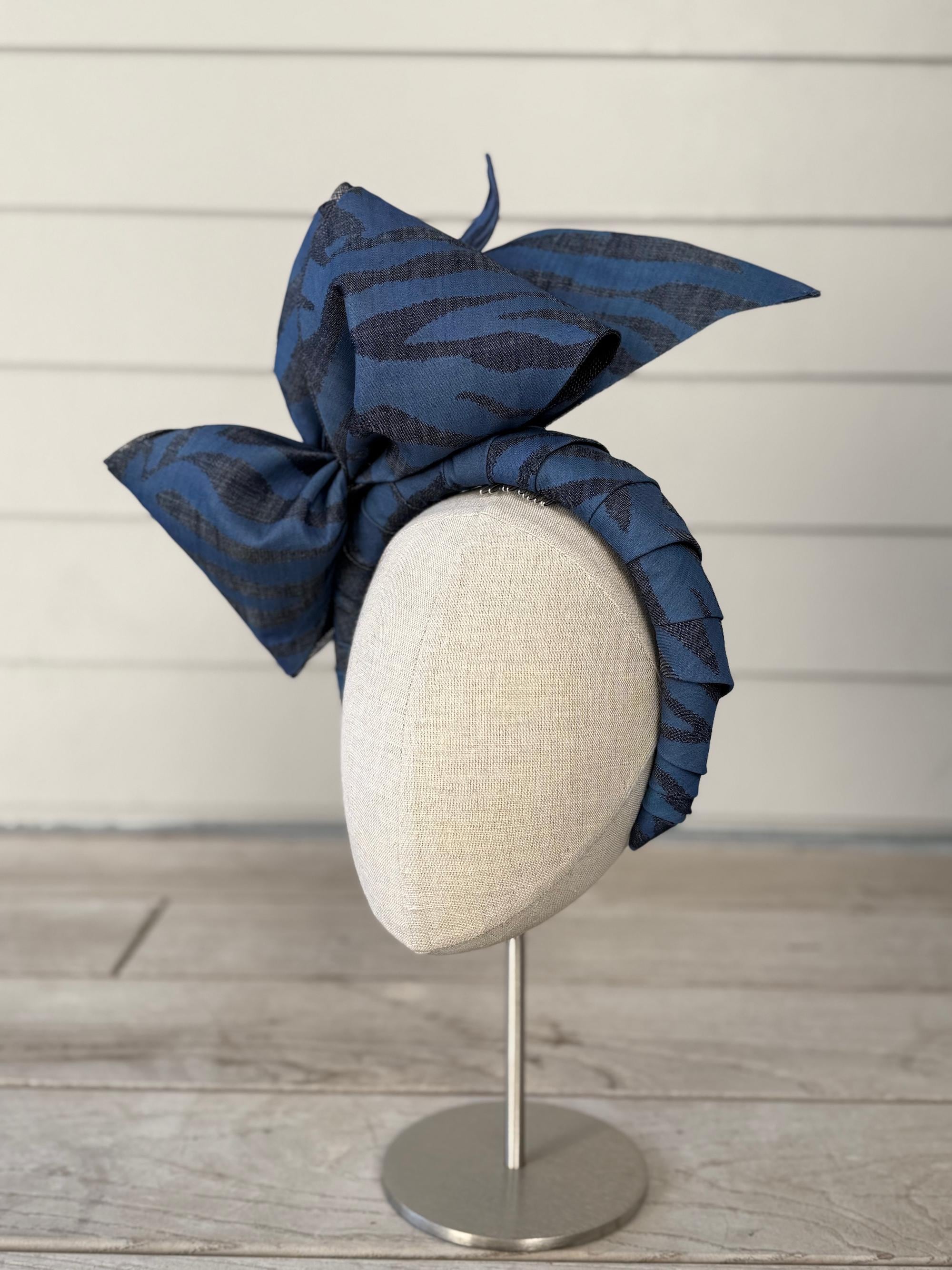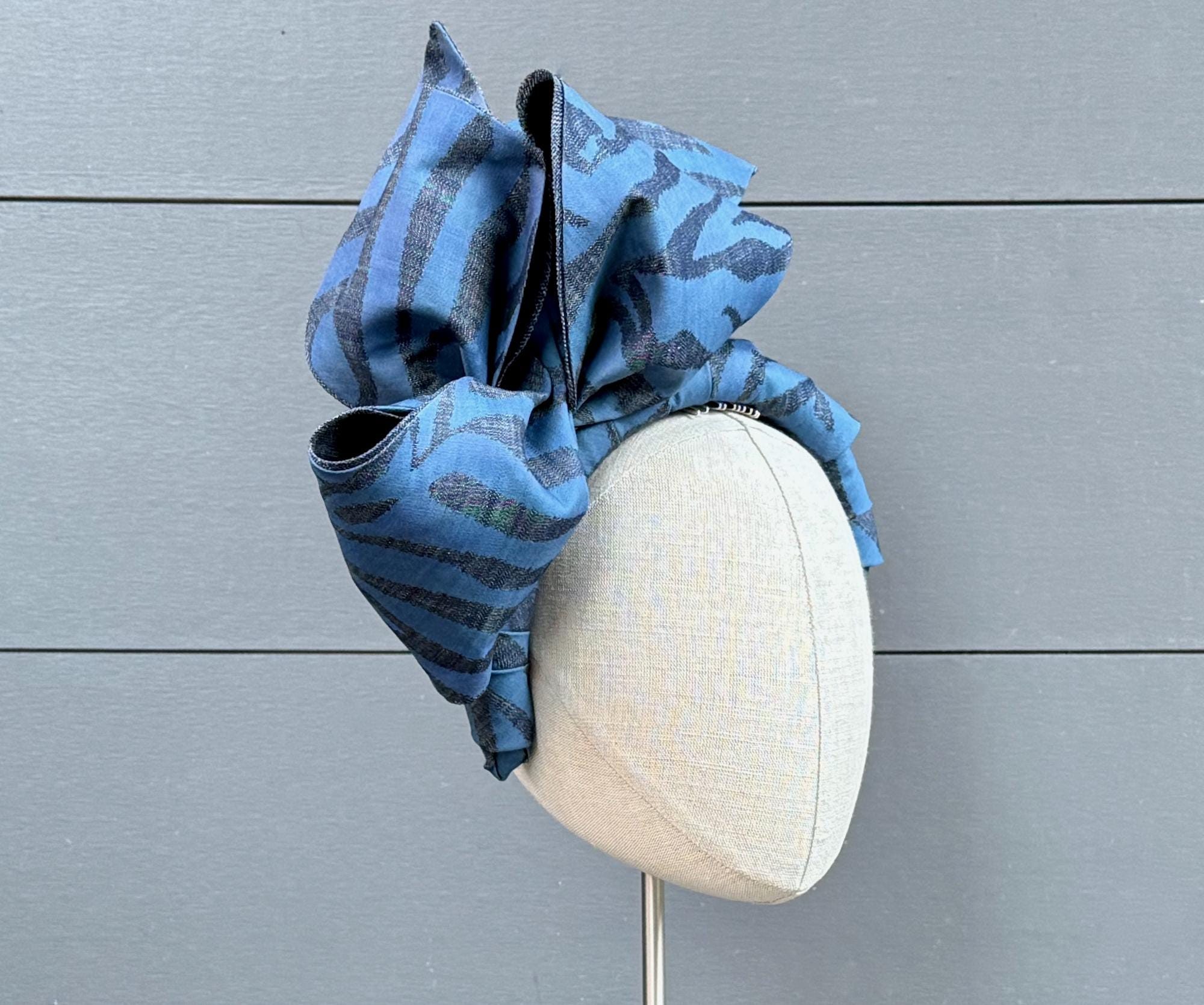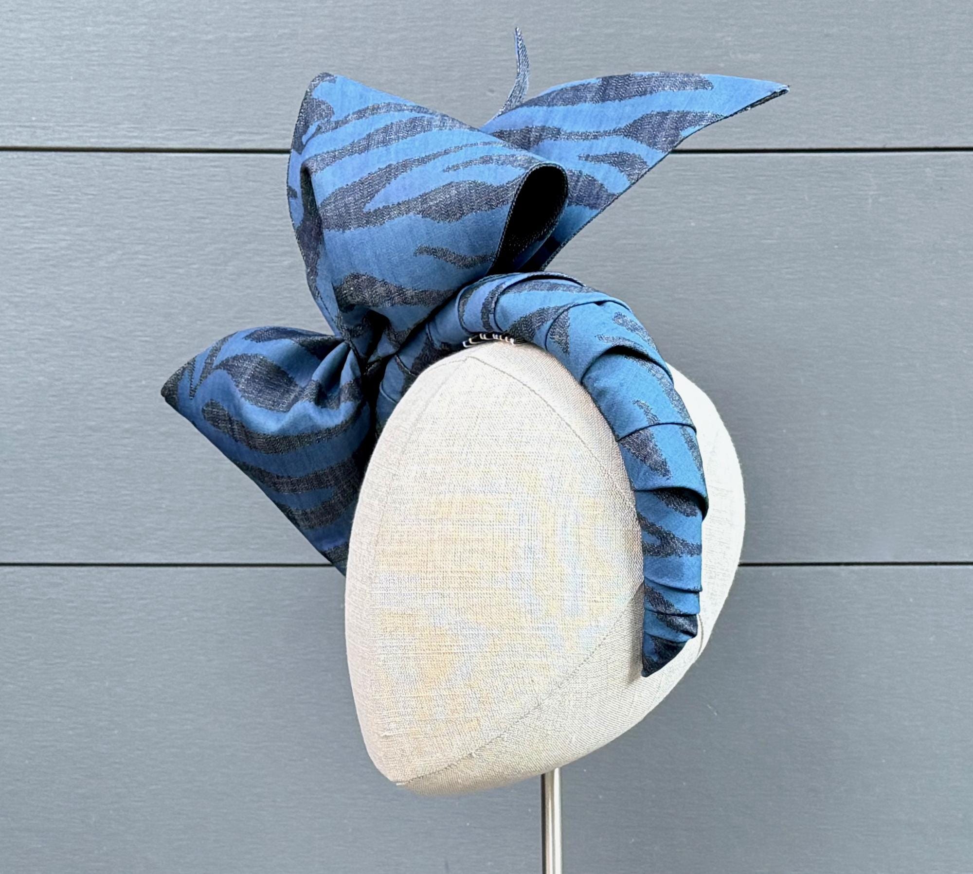 This simply spectacular headband with its oversized bow will turn all heads! The fabric wrapping the headband and making up the front of the bow is a wonderful abstract print of textured gray and denim blue that will go with so many warm-weather ensembles. I see it at a poolside soirée, an art exhibition opening, or even the Kentucky Derby!