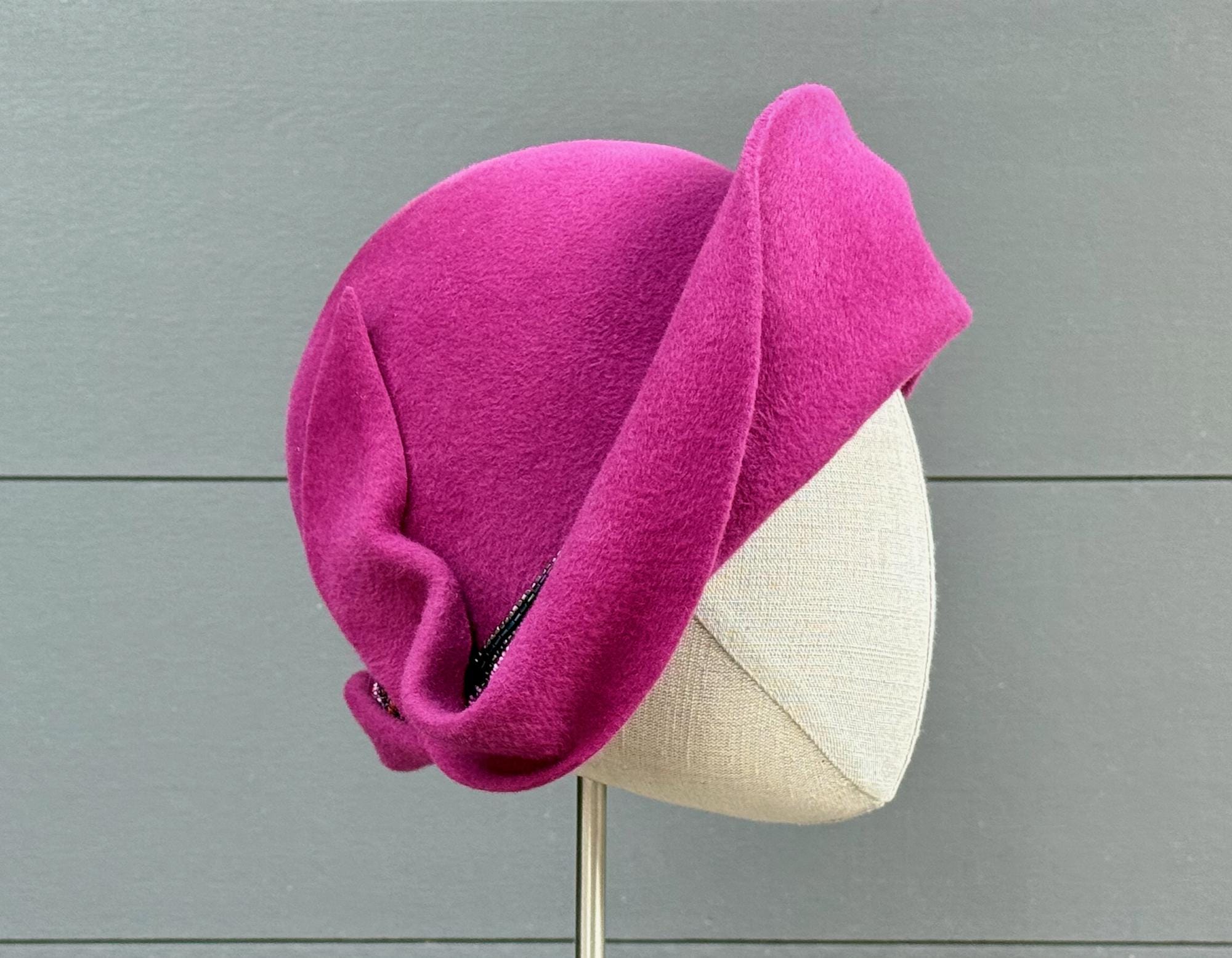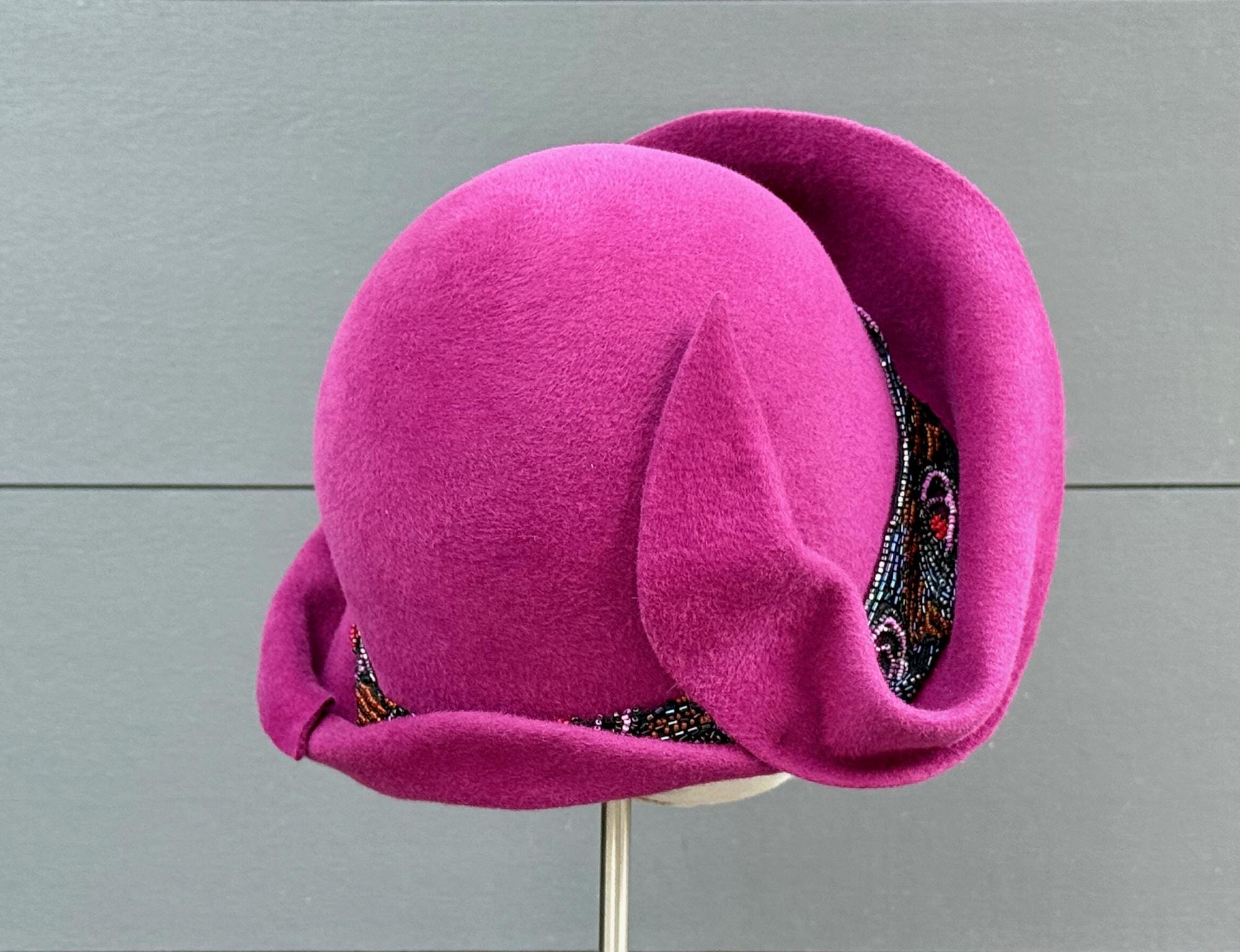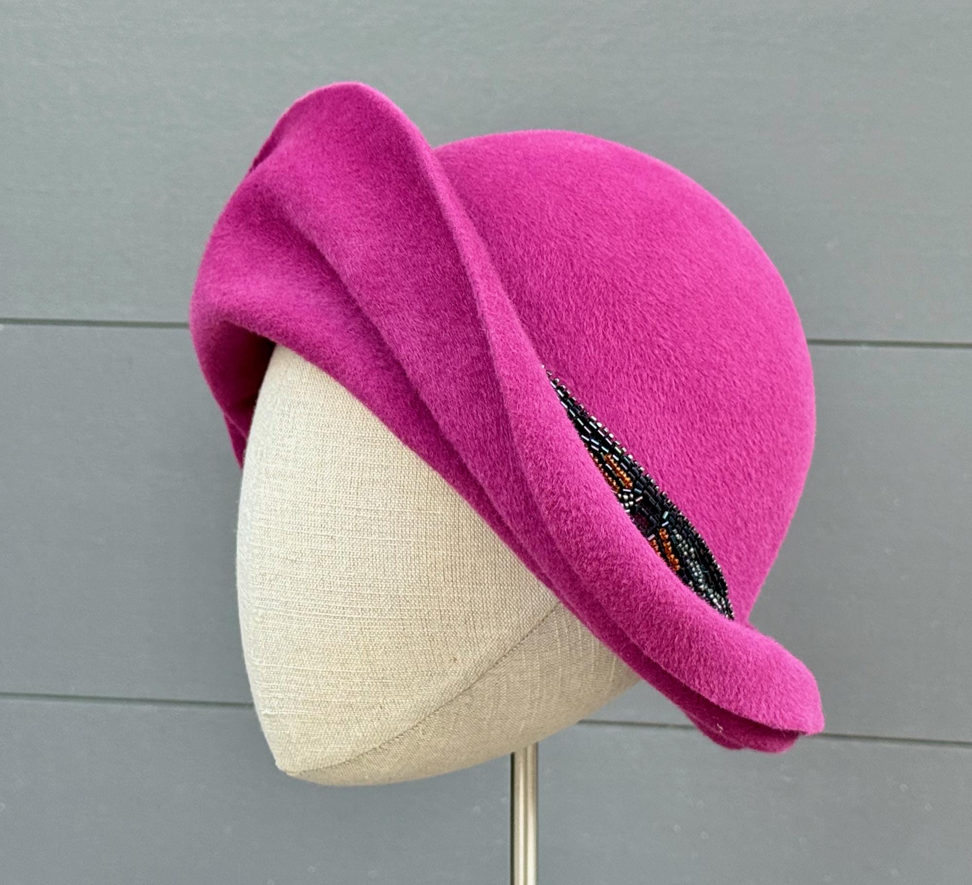 This one-of-a-kind, hand-sculpted cloche is a real showstopper! Blocked from a luxurious, plush velour felt, I've hand-shaped gorgeous folds and layers that will beautifully frame your face. The antique beaded ribbon pulls in some additional colors--black, navy, bright red, rusty orange, and lavender--so you can wear it with even more. Truly gorgeous!