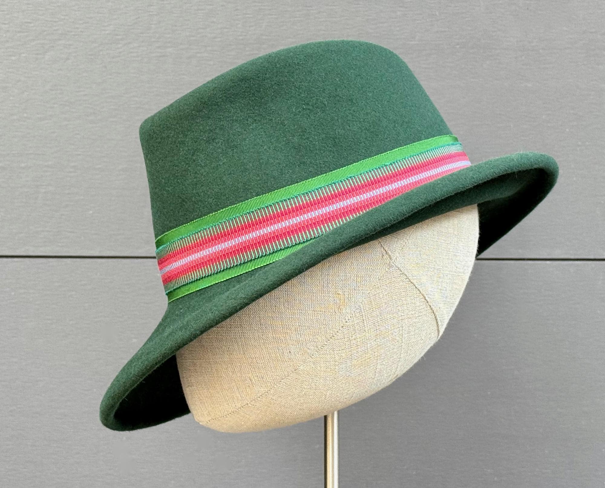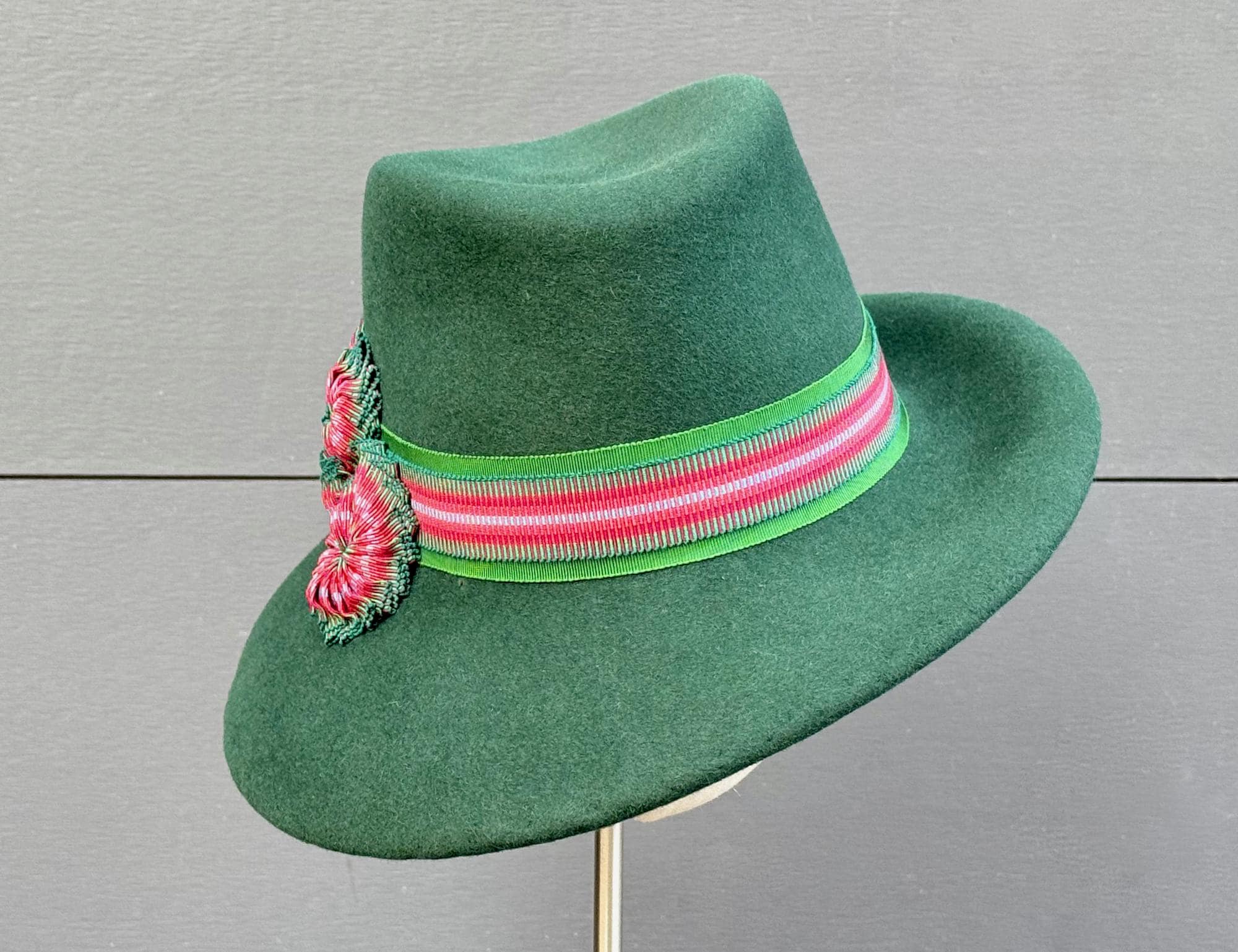 With a sophisticated tilt to one side, this gorgeous brimmed hat offers so much style! A layered band of striped ribbon and handmade cockades make it super-fun to wear for all you color maximalists, too. Blocked on a 23-inch hat block, this hat will best fit a head in the 22-1/2 to 23-inch range. If you have any sizing questions, please don't hesitate to ask them!