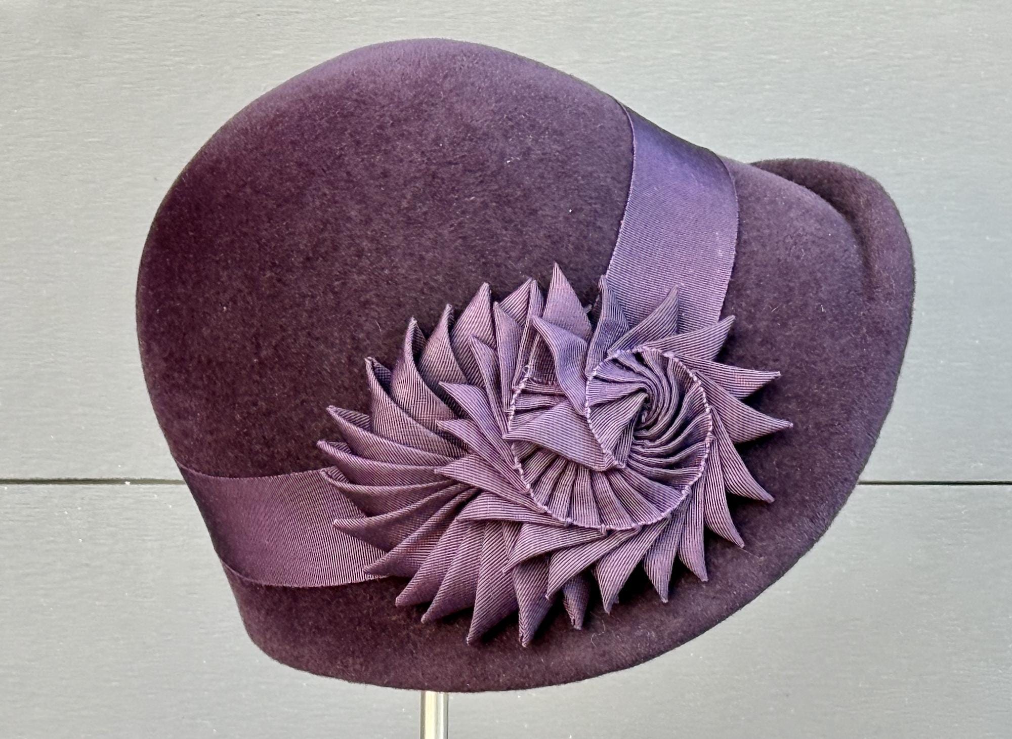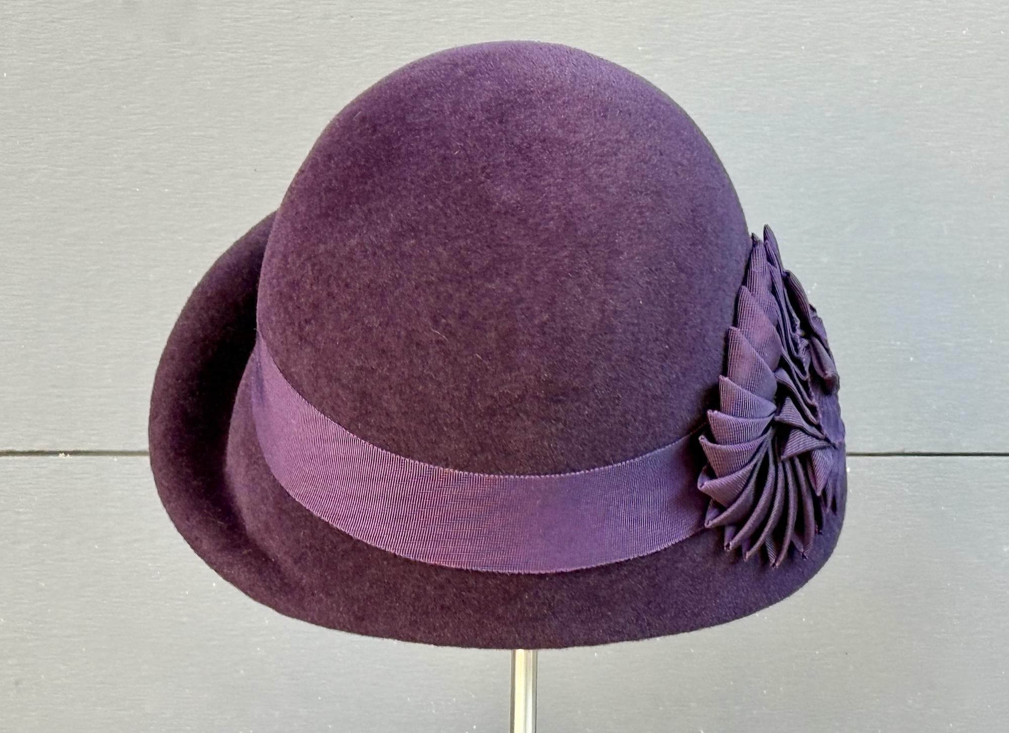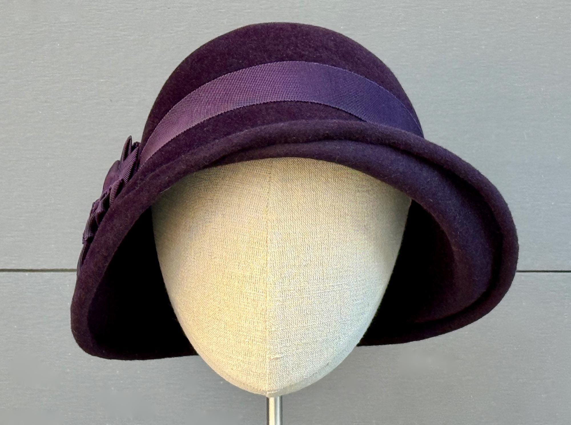 This is a gorgeous cold weather hat that you'll wear for years to come! Blocked in luscious velour felt, this asymmetrical cloche will keep your head warm and your ensemble stylish and pulled together. I trimmed this hat with two large, coordinating ribbon cockades that add intrigue while keeping the color palette simple and easy to wear.