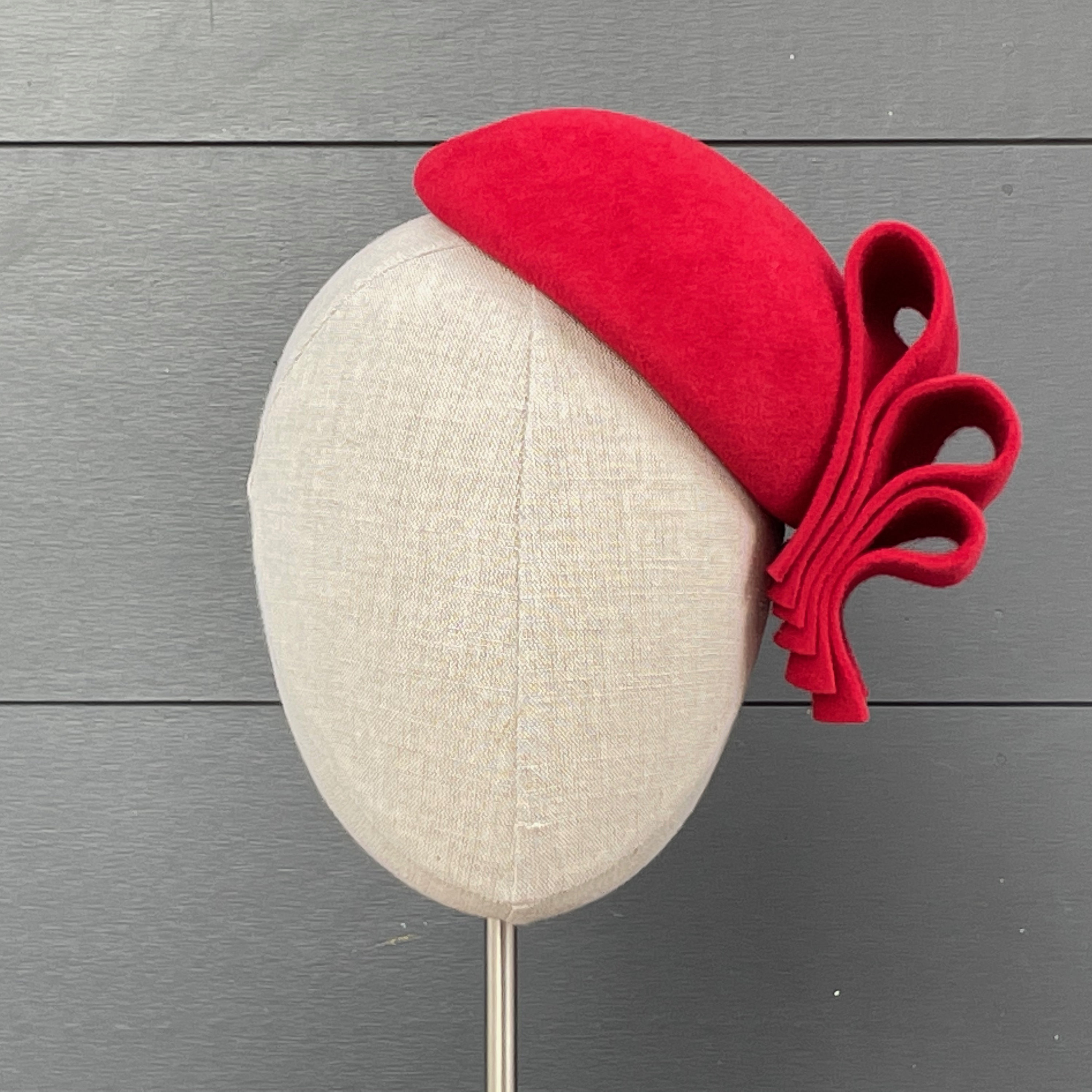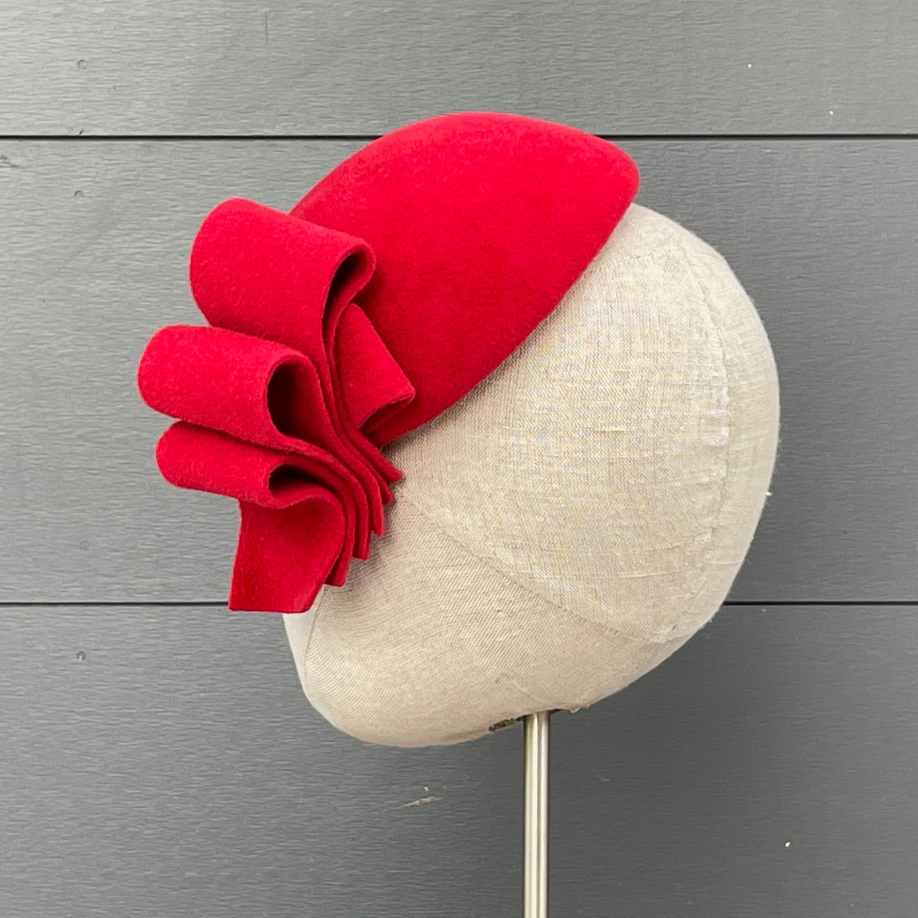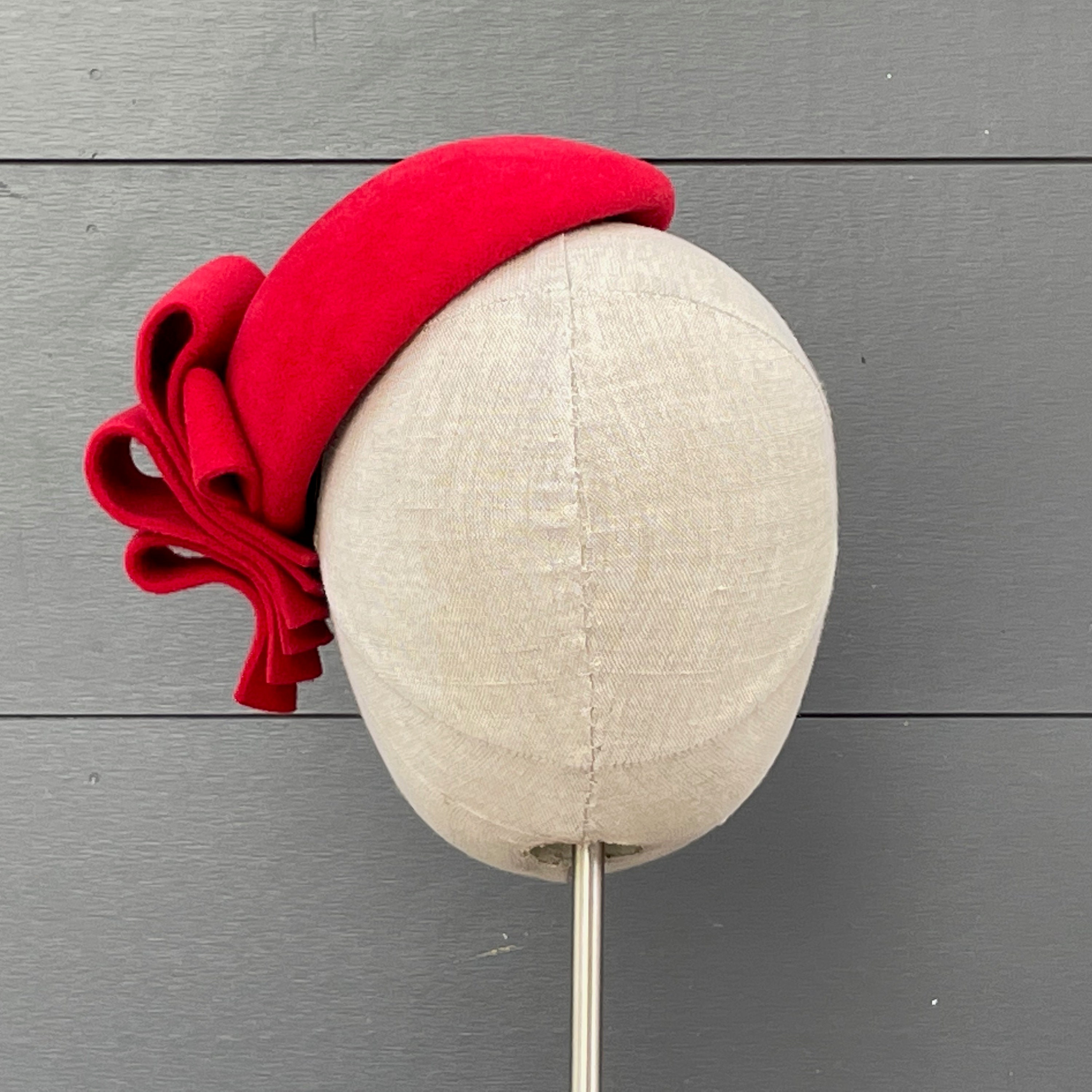 Crafted from luscious, lipstick red velour felt, this little number will elevate both your spirits and your outfit! The simple button shape has a slightly raised little edge detail blocked into it. The trim is the same velour felt sculpted into layered loops that hug your head and frame your face when worn. You'll look absolutely gorgeous in this one!