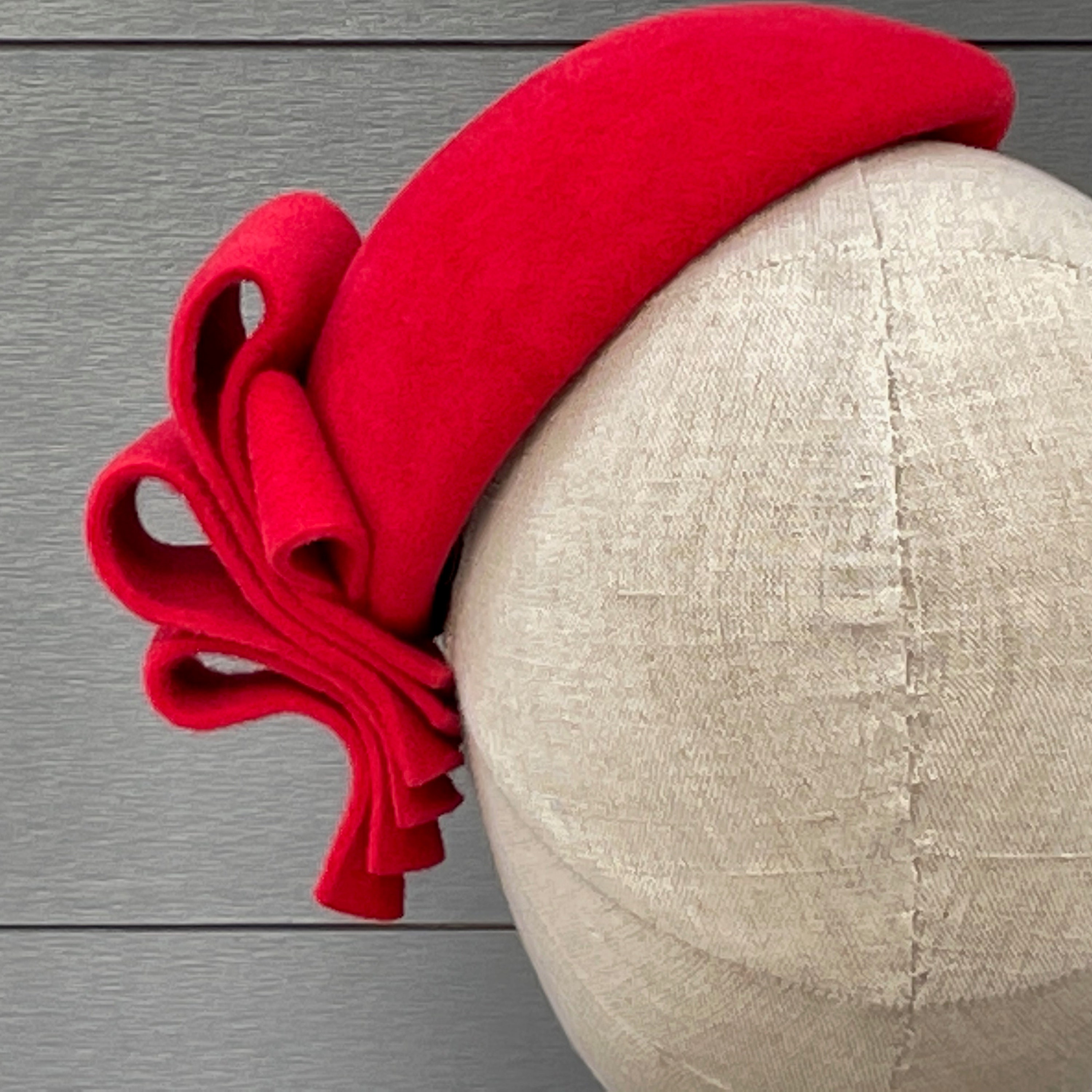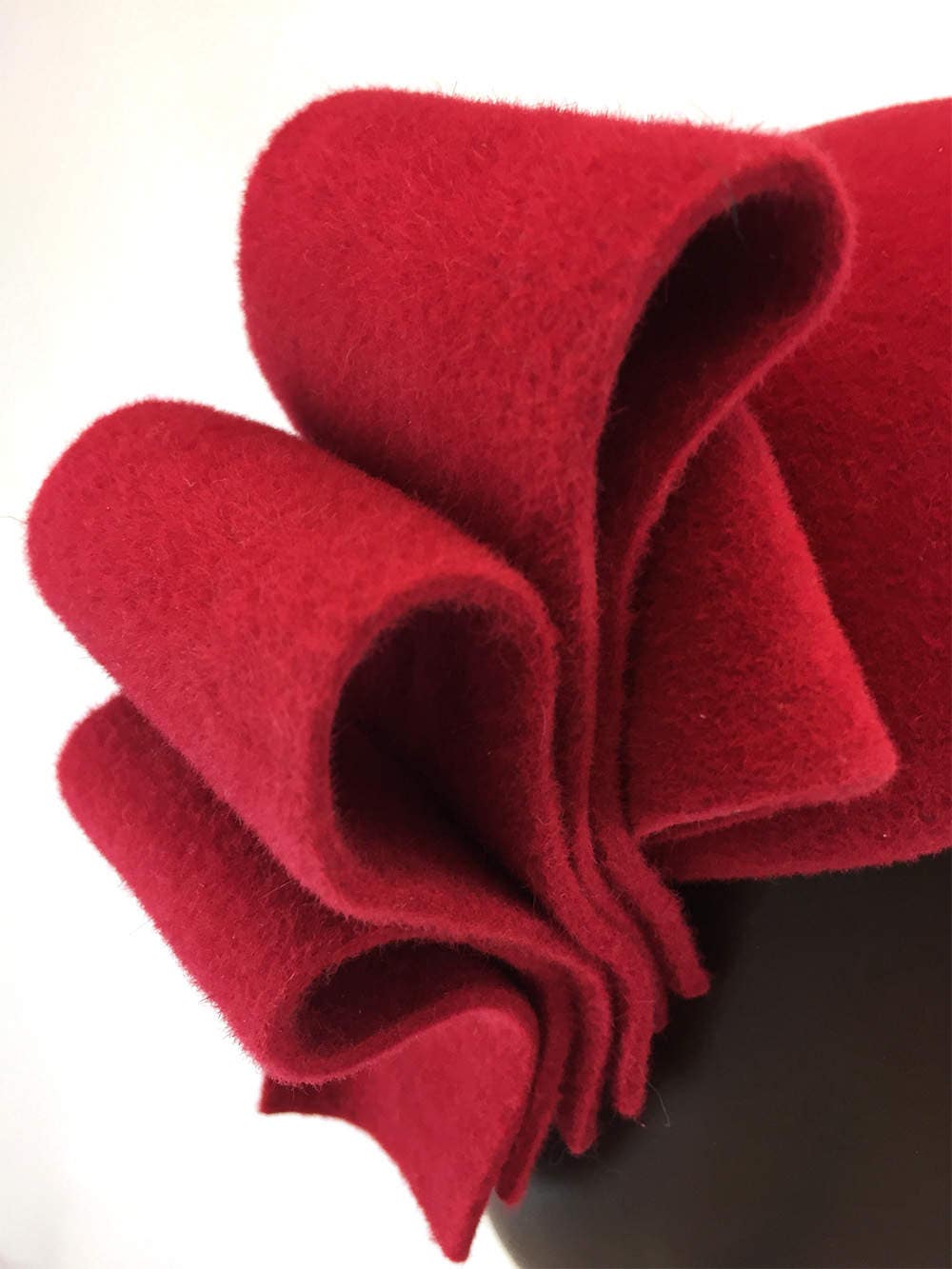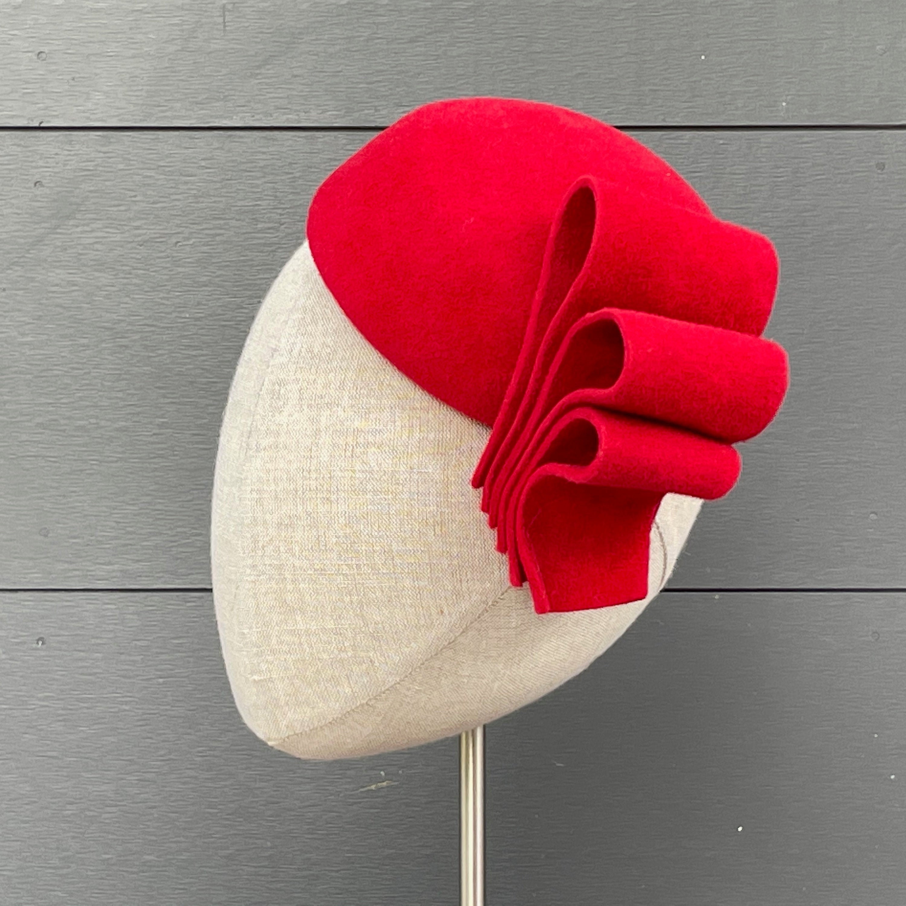 Crafted from luscious, lipstick red velour felt, this little number will elevate both your spirits and your outfit! The simple button shape has a slightly raised little edge detail blocked into it. The trim is the same velour felt sculpted into layered loops that hug your head and frame your face when worn. You'll look absolutely gorgeous in this one!