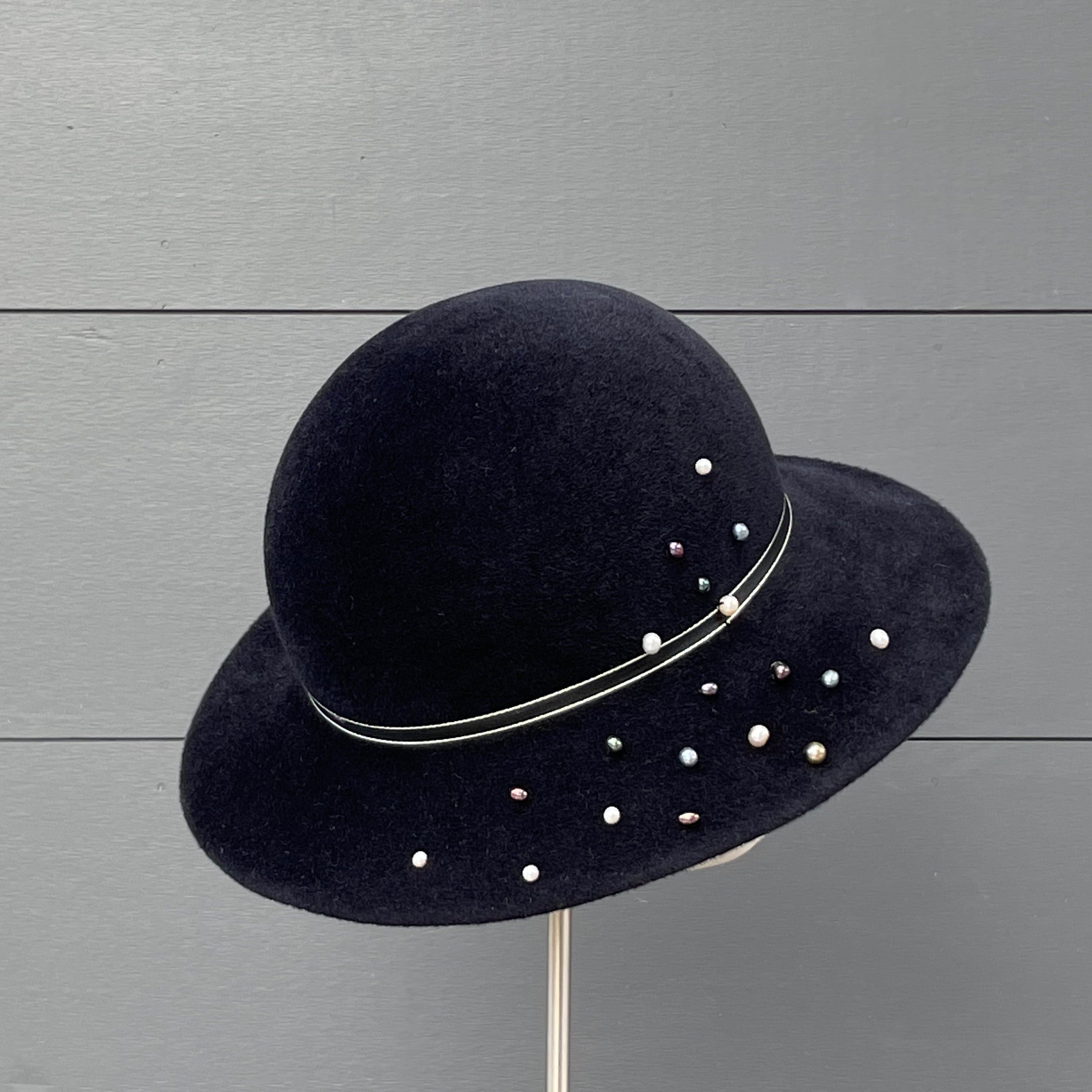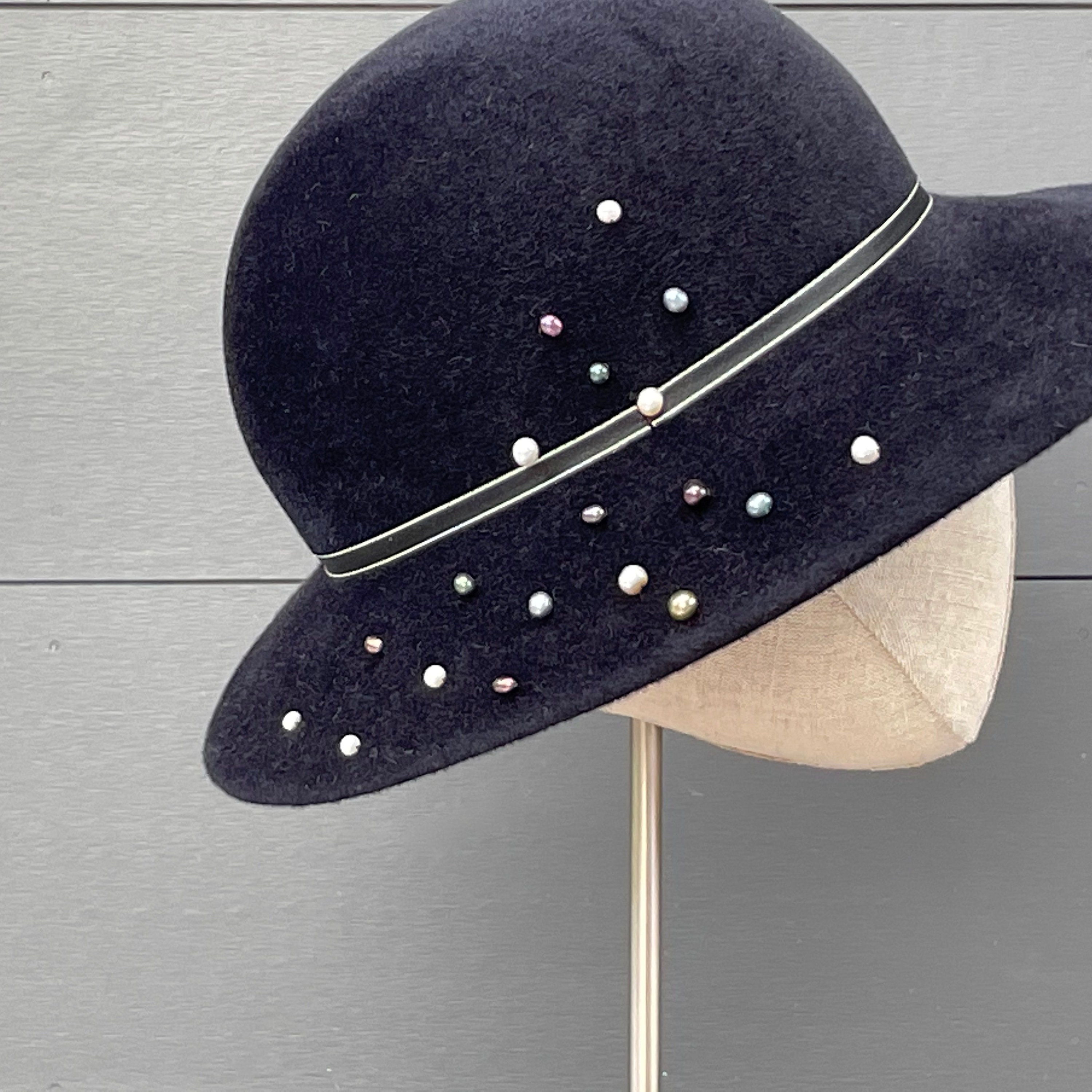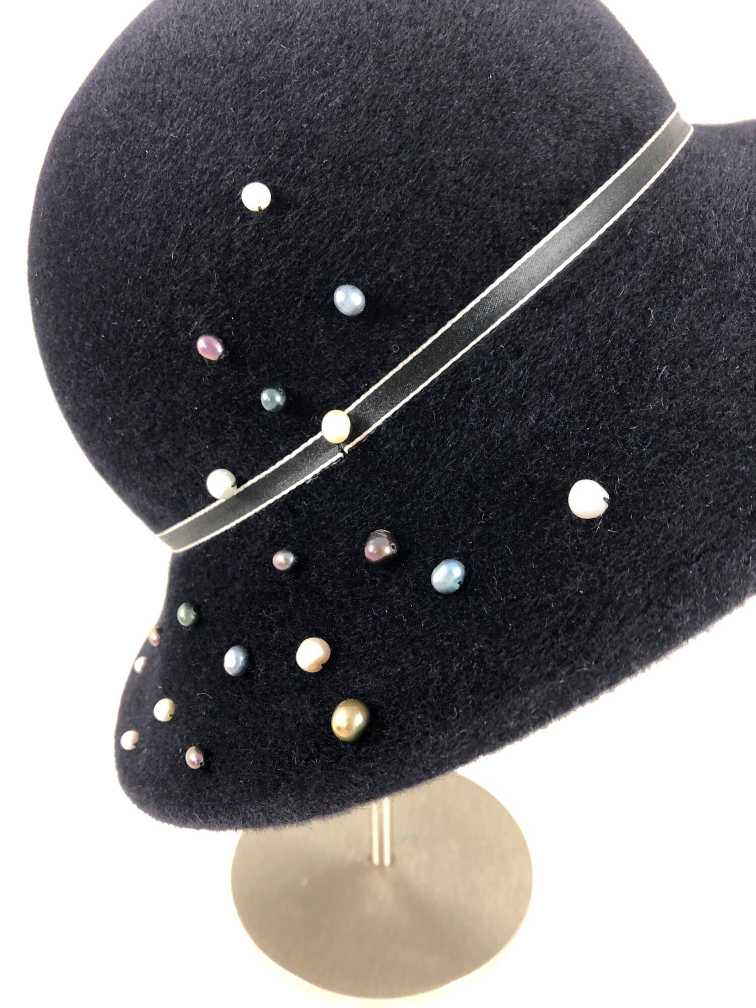 This is a wonderfully wearable hat with just enough flair to make it special without taking it out of the realm of everyday headwear. It is crafted from a luxurious quality velour felt that will keep you warm in the cold months, and has a slight asymmetrical downturn to the brim. I've added some narrow, striped antique ribbon for a simple hat band along with a scattering of freshwater pearl beads in assorted soft colors. Simple and very elegant indeed.