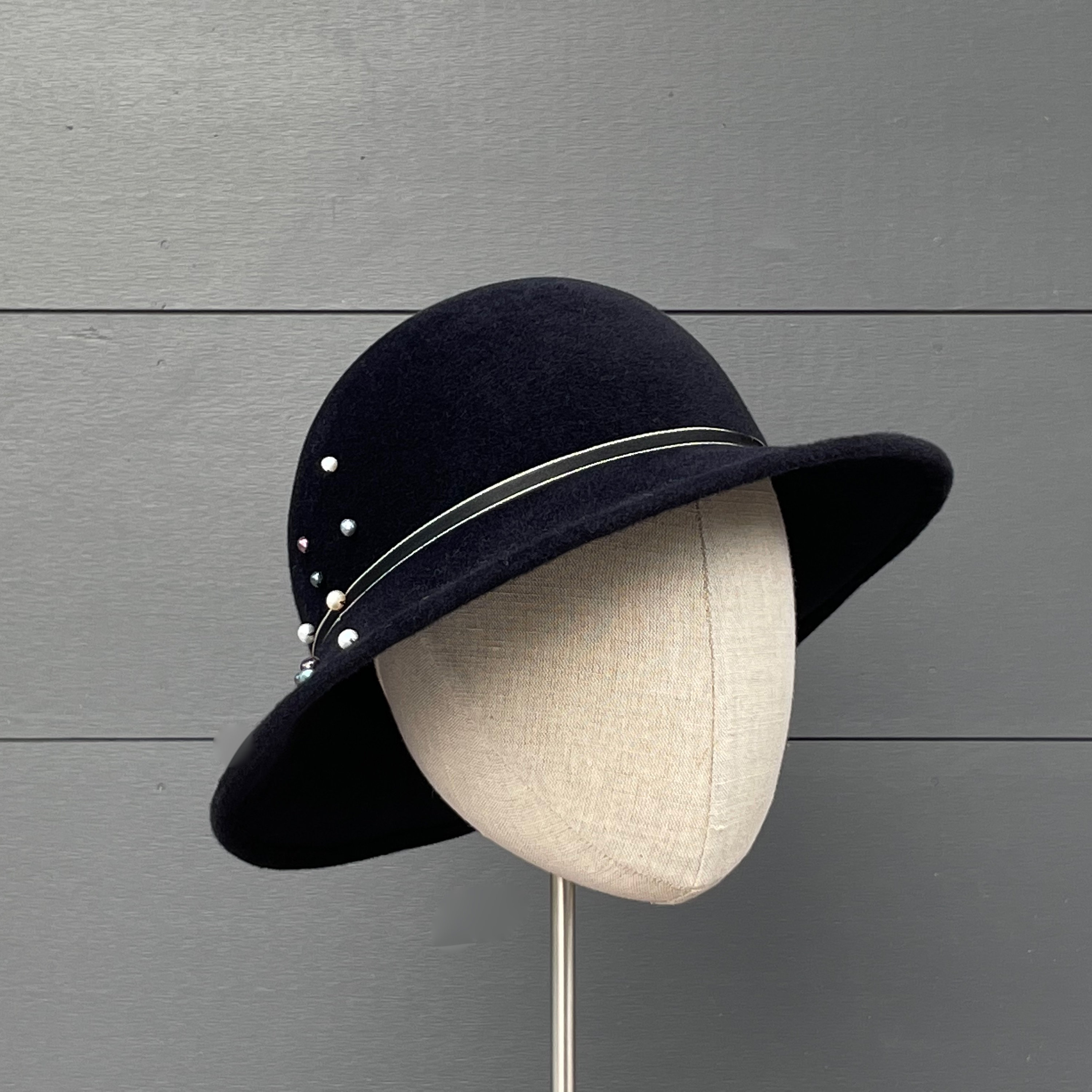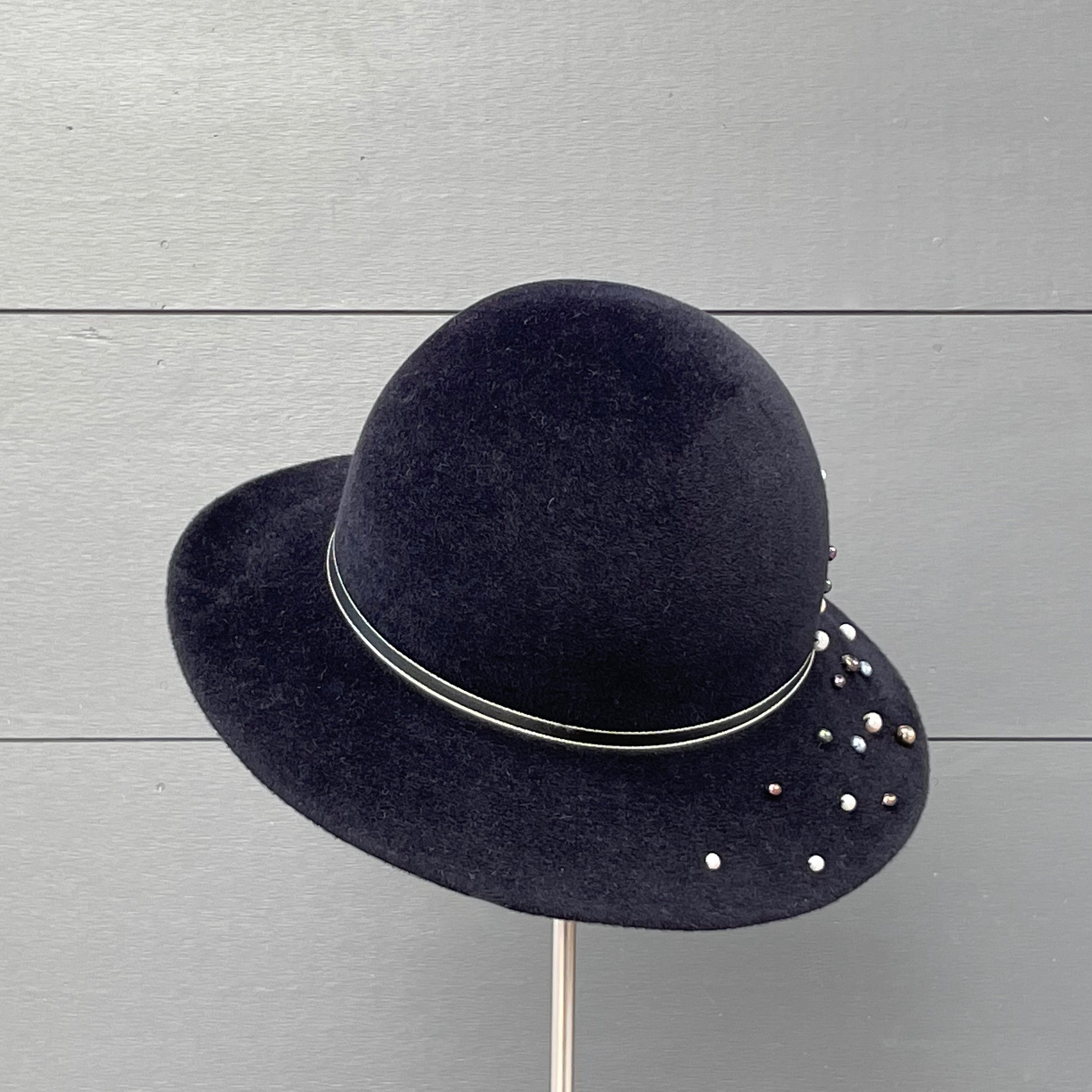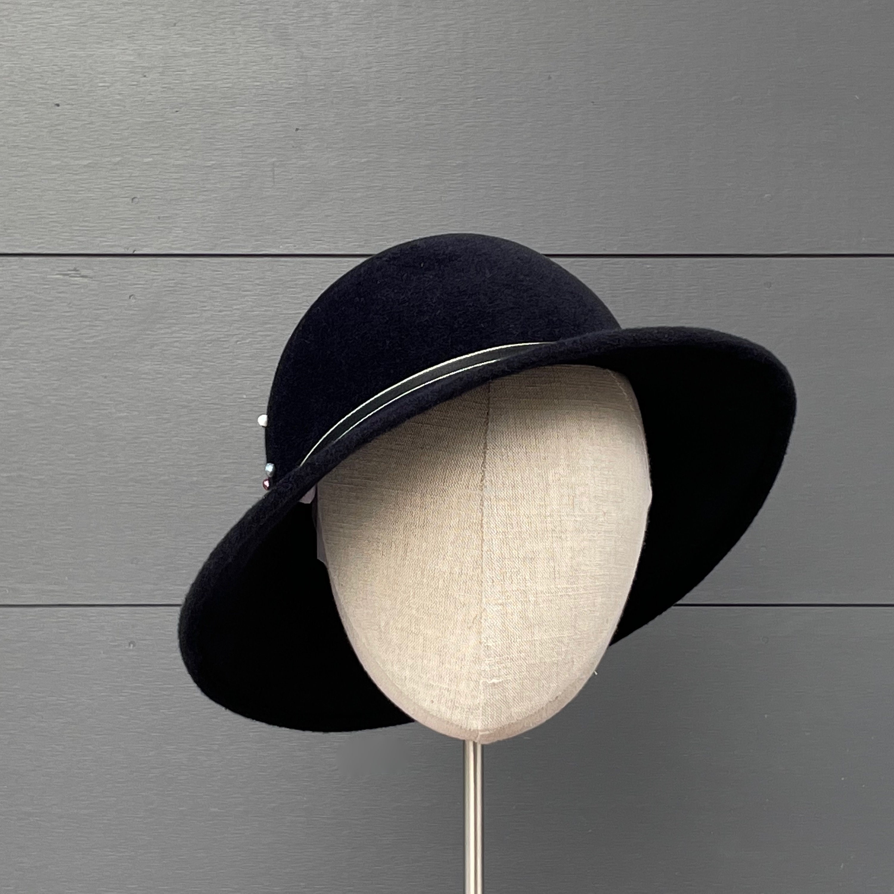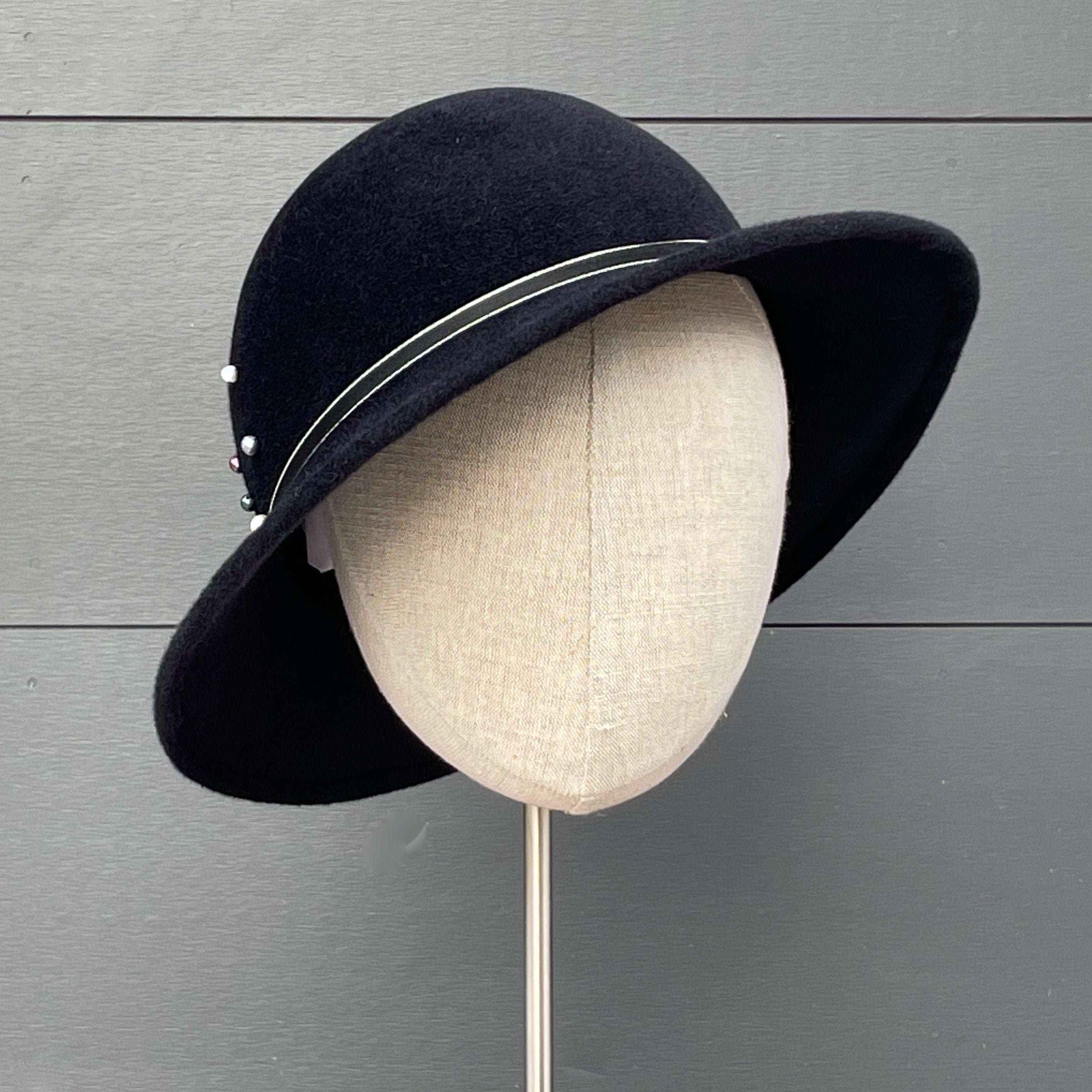 This is a wonderfully wearable hat with just enough flair to make it special without taking it out of the realm of everyday headwear. It is crafted from a luxurious quality velour felt that will keep you warm in the cold months, and has a slight asymmetrical downturn to the brim. I've added some narrow, striped antique ribbon for a simple hat band along with a scattering of freshwater pearl beads in assorted soft colors. Simple and very elegant indeed.
